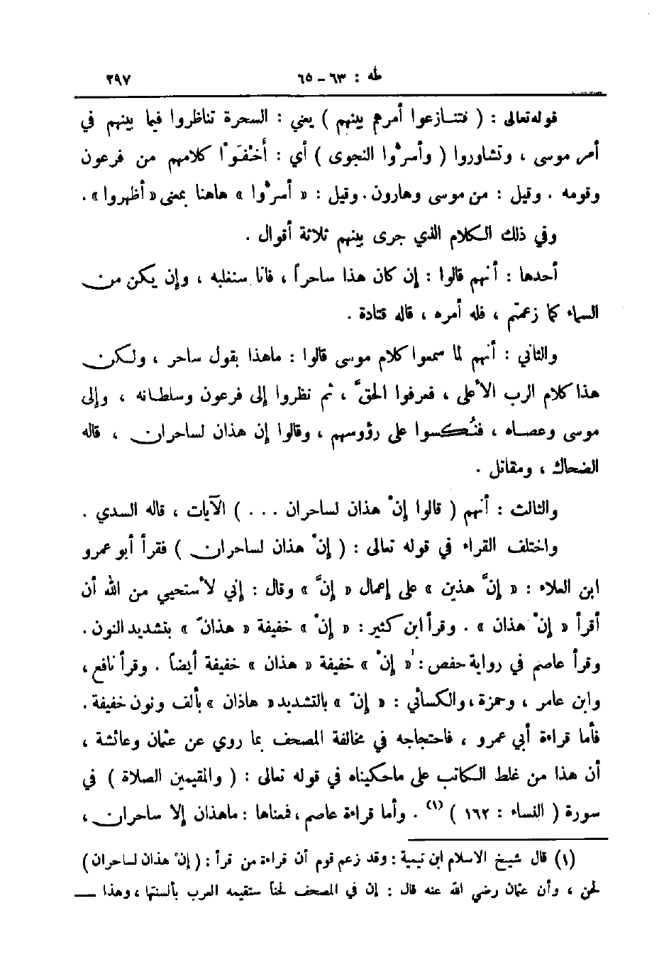 واختلف القراء في قوله تعالى إن هذان لساحران فقرأ ابو عمرو ابن العلاء إن هذين على إعمال إن وقال إني لأستحيي من الله أن أقرأ إن هذان وقرأ ابن كثير إن خفيفه هذان بتشديد النون وقرأ عاصم في رواية حفص إن خفيفة هذان خفيفه أيضا وقرأ نافع وابن عامر وحمزة والكسائي إن بالتشديد هاذان بألف ونون خفيفة فأما قراءة ابي عمرو فاحتجاجه في مخالفة المصحف بما روي عن عثمان وعائشة أن هذا من غلط الكاتب على ما حكيناه في قوله تعالى والمقيمين الصلاة في سورة النساء 162 وأما قراءة عاصم فمعناها ما هذان الا ساحران