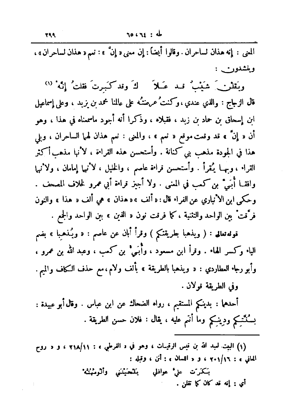 قال الزجاج والذي عندي وكنت عرضته على عالمنا محمد بن يزيد وعلى أسماعيل ابن اسحاق بن حماد بن زيد فقبلاه وذكرا أنه أجود ما سمعناه في هذا وهو أن إن قد وقعت موقع نعم والمعنى نعم هذان لهما الساحران ويلي هذا في الجودة مذهب بني كنانة واستحسن هذه القراءة لأنها مذهب أكثر القراء وبها يقرأ واستحسن قراءة عاصم والخليل لأنهما إمامان ولأنهما وافقا أبي بن كعب في المعنى ولا أجيز قراءة أبي عمرو لخلاف المصحف وحكى ابن الأنباري عن الفراء قال الف هذان هي ألف هذا والنون فرقت بين الواحد والتثنية كما فرقت نون الذين بين الواحد والجمع