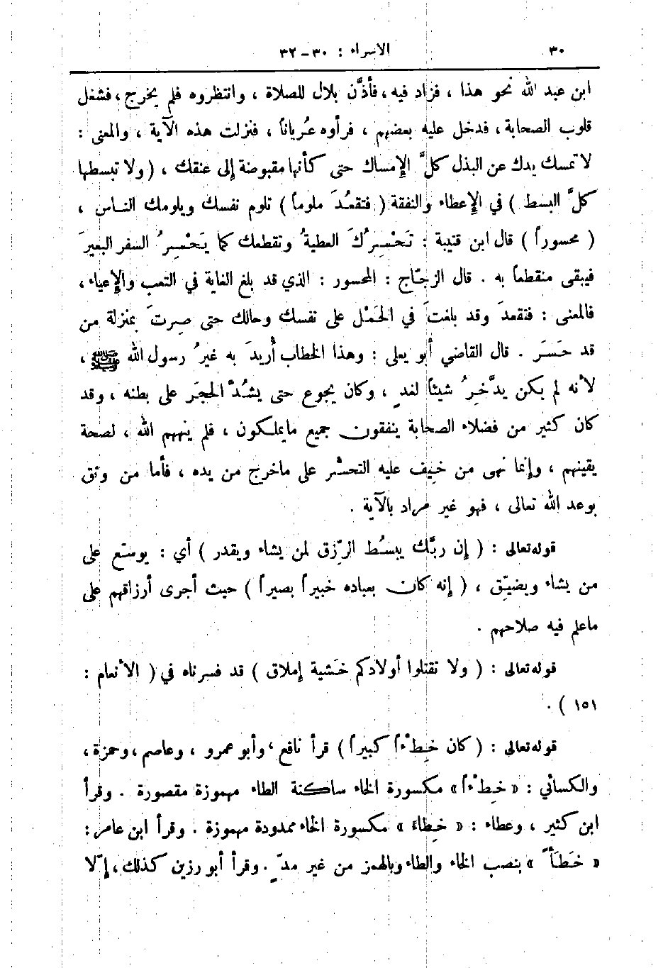 ابن عبد الله نحو هذا فزاد فيه فأذن بلال للصلاة وانتظروه فلم يخرج فشغل قلوب الصحابة فدخل عليه بعضهم فرأوه عريانا فنزلت هذه الاية والمعنى لا تمسك يدك عن البذل كل الامساك حتى كأنها مقبوضة الى عنقك ولا تبسطها كل البسط في الاعطاء والنفقة فتقعد ملوما تولم تلوم نفسك ويلومك الناس محسورا قال ابن قتيبة تحسرك العطية وتقطعك كما يحسر السفر البعير فيبقى منقطعا به قال الزجاج المحسور الذي قد بلغ الغاية في التعب والإعياء فالمعنى فتقعد وقد بلغت في الحمل على نفسك وحالك حتى صرت بمنزلة من قد حسر قال القاضي ابو يعلى وهذا الخطاب اريد به غير رسول الله صلى الله عليه و سلم لأنه لم يكن يدخر شيئا لغد وكان يجوع حتى يشد الحجر على بطنه وقد كان كثير من فضلاء الصحابة ينفقون جميع ما يملكون فلم ينههم الله لصحة يقينهم وانما نهى من خيف عليه التحسر على ما خرج من يده فأما من وثق بوعد الله تعالى فهو غير مراد بالاية