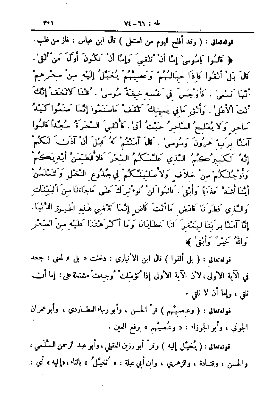 قالوا يا موسى إما أن تلقي وإما أن نكون أول من ألقى قال بل ألقوا فاذا حبالهم وعصيهم يخيل اليه من سحرهم أنها تسعى فأوجس في نفسه خيفة موسى قلنا لا تخف إنك أنت الأعلى وألق ما في يمينك تلقف ما صنعوا إنما صنعوا كيد ساحر ولا يفلح الساحر حيث أتى فألقي السحرة سجدا قالوا آمنا برب هرون وموسى قال آمنتم له قبل أن آذن لكم إنه لكبيركم الذي علمكم السحر فلأقطعن أيديكم وارجلكم من خلاف ولاصلبنكم في جذوع النخل ولتعلمن أينا أشد عذابا وأبقى قالوا لن نؤثرك على ما جاءنا من البينات والذي فطرنا فاقض ما أنت قاض إنما تقضي هذه الحيوة الدنيا إنا آمنا بربنا ليغفر لنا خطايانا وما أكرهتنا عليه من السحر والله خير وأبقى
