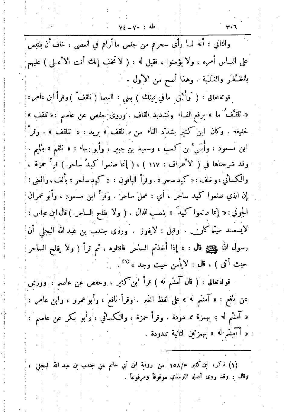 قوله تعالى وألق ما في يمينك يعني العصا تلقف وقرأ ابن عامر تلقف ما برفع الفاء وتشديد القاف وروى حفص عن عاصم تلقف خفيفة وكان ابن كثير يشدد التاء من تلقف يريد تتلقف وقرأ ابن مسعود وأبي بن كعب وسعيد بن جبير وأبو رجاء تلقم بالميم وقد شرحناها في الأعراف 117 إنما صنعوا كيد ساحر قرأ حمزة والكسائي وخلف كيد السحر وقرأ الباقون كيد ساحر بألف والمعنى إن الذي صنوا يد ساحر أي عمل ساحر وقرأ ابن مسعود وأبو عمران الجوني إنما صنعوا كيد بنصب الدال ولا يفلح الساحر قال ابن عباس لا يسعد حيثما كان وقيل لا يفوز وروى جندب بن عبدالله البجلي أن رسول الله صلى الله عليه و سلم قال إذا أخذتم الساحر فاقتلوه ثم قرأ ولا يفلح الساحر حيث أتى قال لا يأمن حيث وجد