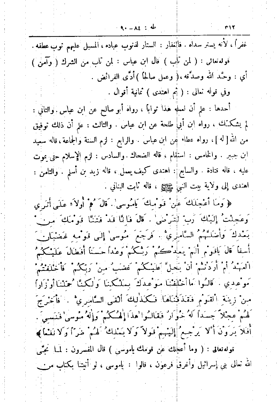 وما أعجلك عن قومك يا موسى قال هم أولاء على أثري وعجلت اليك رب لترضى قال فانا قد فتنا قومك من بعدك وأضلهم السامري فرجع موسى الى قومه غضبان اسفا قال يا قوم الم يعدكم ربكم وعدا حسنا أفطال عليكم العهد أم أردتم أن يحل عليكم غضب من ربكم فأخلفتم موعدي قالوا ما أخلفنا موعدك بملكنا ولكنا حملنا أوزارا من زينة القوم فقذفناها فكذلك ألقى السامري فاخرج لهم عجلا جسدا له خوار فقالوا هذا إلهكم وإله موسى فنسي أفلا يرون ألا يرجع إليهم قولا ولا يملك لهم ضرا ولا نفعا