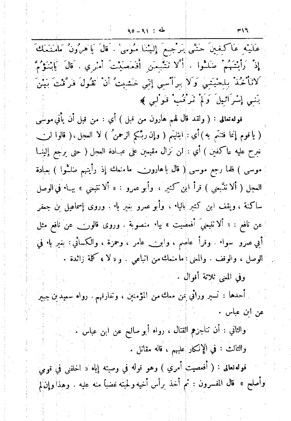 عليه عاكفين حتى يرجع الينا موسى قال يا فرون ما منعك اذ رأيتهم ضلوا ألا تتبعن أفعصيت أمري قال يا بنؤم لا تأخذ بلحيتي ولا برأسي إني خشيت أن تقول فرقت بين بني اسرائيل ولم ترقب قولي
