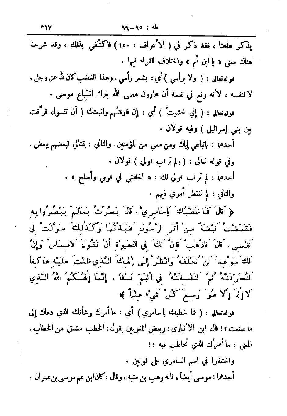 قال فما خطبك يا سامري قال بصرت بمالم يبصروا به فقبضت قبضة من أثر الرسول فنبذتها وكذلك سولت لي نفسي قال فاذهب فان لك في الحيوة ان تقول لا مساس وإن لك موعدا لن تخلفه وانظر الى الهك الذي ظلت عليه عاكفا لنحرقنه ثم لننسفنه في اليم نسفا إنما الهكم الله الذي لا إله الا هو وسع كل شي علما