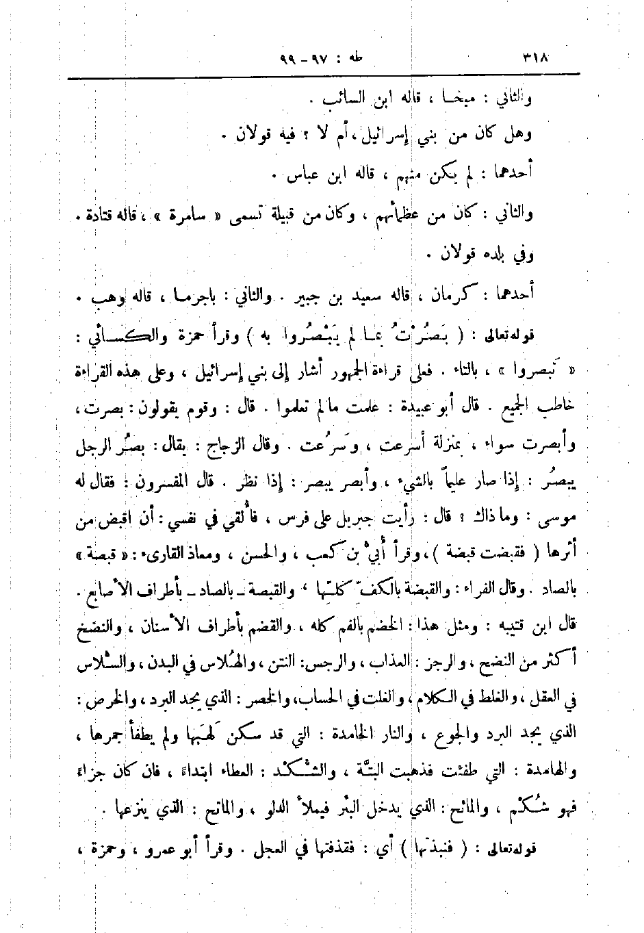 قوله تعالى بصرت بما لم يبصروا به وقرأ حمزة والكسائي تبصروا بالتاء فعلى قراءة الجمهور أشار الى بني اسرائيل وعلىهذه القراءة خاطب الجميع قال ابو عبيدة علمت ما لم تعلموا قال وقوم يقولون بصرت وأبصرت سواء بمنزلة اسرعت وسرعت وقال الزجاج يقال بصر الرجل يبصر إذا صار عليما بالشيء وأبصر يبصر إذا نظر قال المفسرون فقال له موسى وما ذاك قال رأيت جبريل على فرس فألقي في نفسي أن اقبض من أثرها فقبضت قبضة وقر أبي بن كعب والحسن ومعاذ القارئ قبصة بالصاد وقال الفراء والقبضة بالكف كلها والقبصة بالصاد بأطراف الاصابع قال ابن قتيبه ومثل هذا الخضم بالفم كله والقضم بأطراف الاسنان والنضخ أكثر من النضح والرجز العذاب والرجس النتن والهلاس في البدن والسلاس في العقل والغلط في الكلام والغلت في الحساب والخصر الذي يجد البرد والخرص الذي يجد البرد والجوع والنار الخامدة التي قد سكن لهبها ولم يطفا جمرها والهامدة التي طفئت فذهبت البتة والشكد العطاء ابتداء فان كان جزاء فهو شكم والمائج الذي يدخل البئر فيملأ الدلو والماتح الذي ينزعها