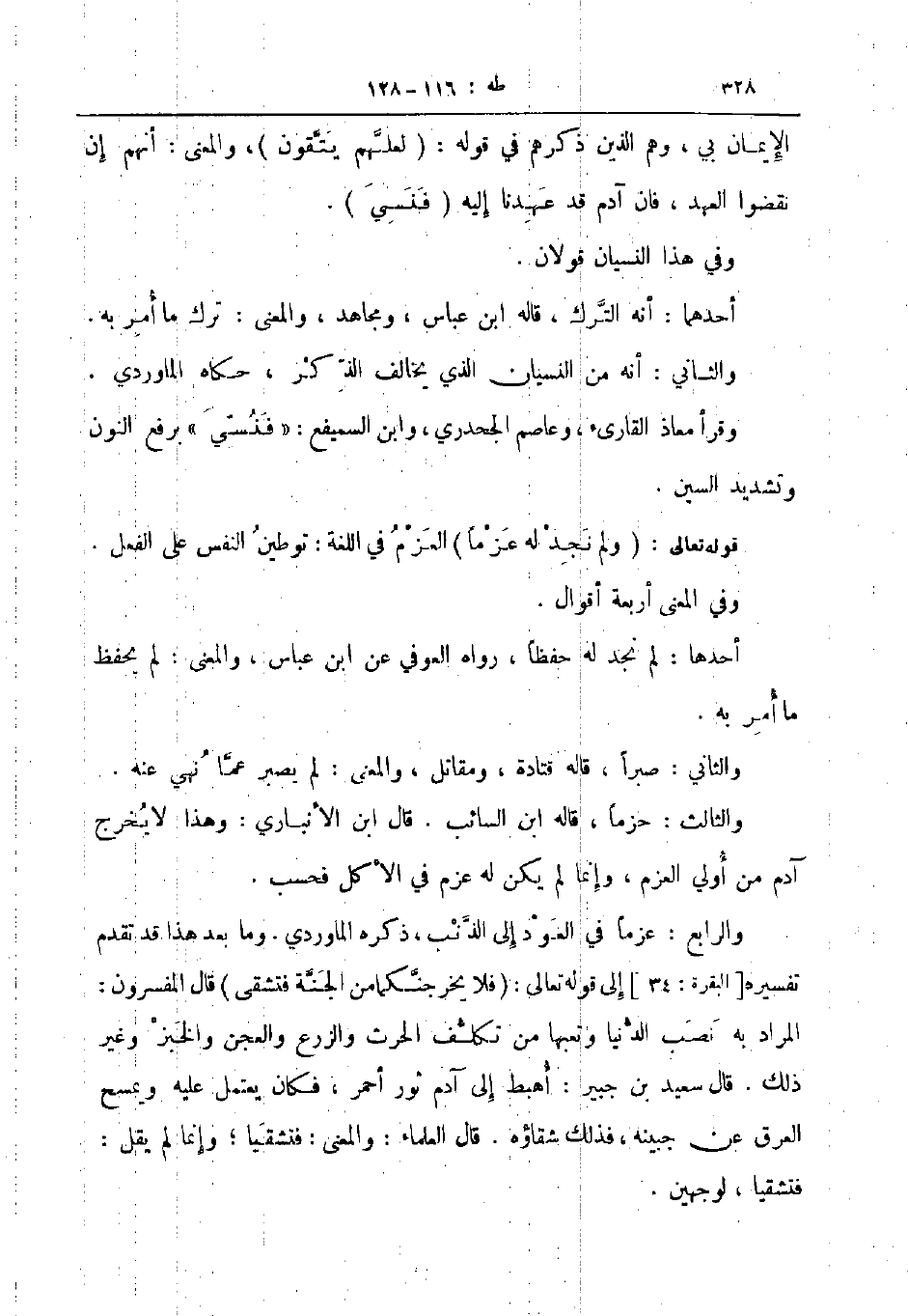 والرابع عزما في العود الى الذنب ذكره الماوردي وما بعد هذا قد تقدم تفسيره البقرة 34 الى قوله تعالى فلا يخرجنكما من الجنة فتشقى قال المفسرون المراد به نصب الدنيا وتعبها من تكلف الحرث والزرع والعجن والخبز وغير ذلك قال سعيد بن جبير أهبط الى آدم ثور أحمر فكان يعتمل عليه ويمسح العرق عن جبينه فذلك شقاؤه قال العلماء والمعنى فتشقيا وإنما لم يقل فتشقيا لوجهين