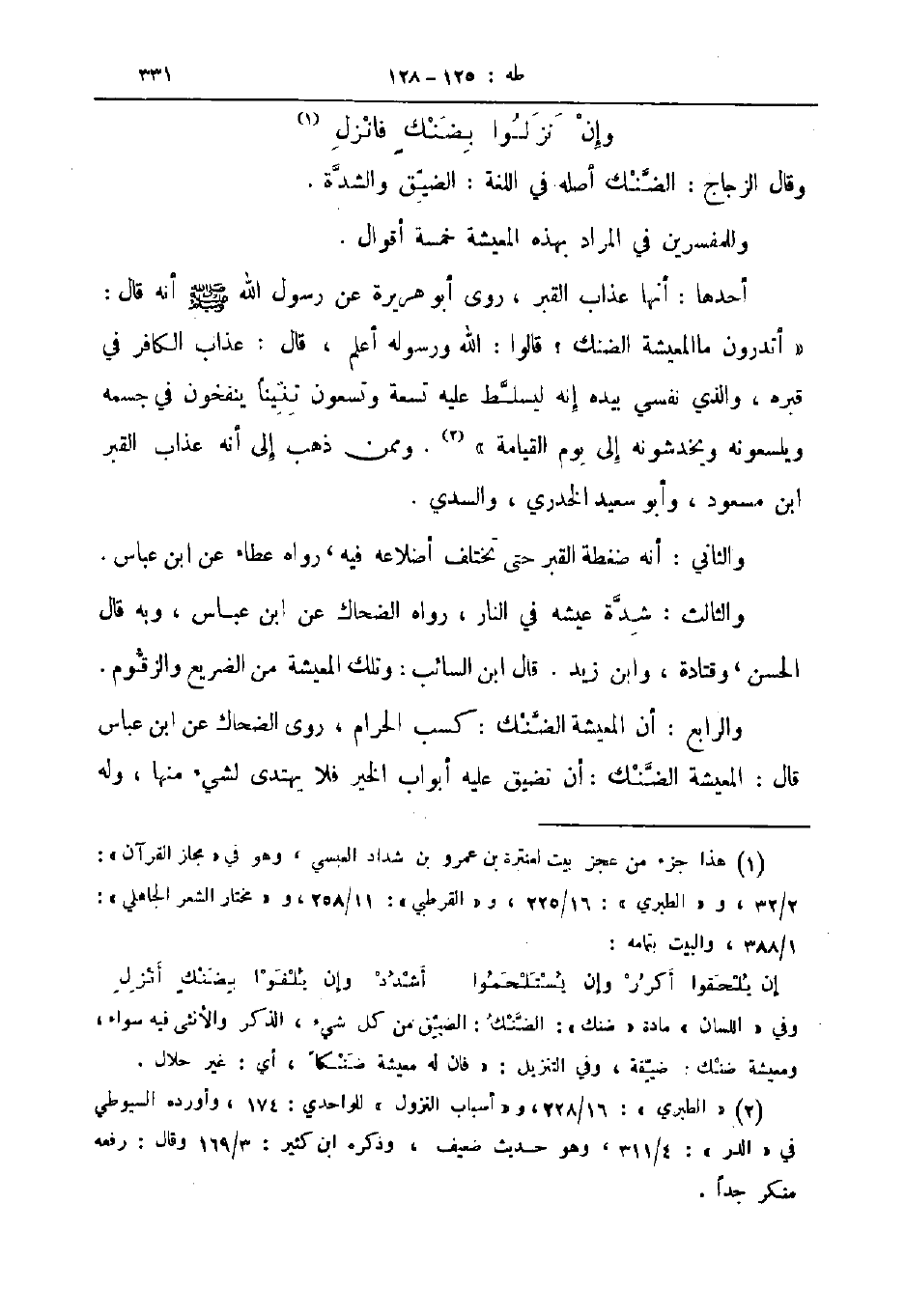 أحدها أنها عذاب القبر روى أبو هريرة عن رسول الله صلى الله عليه و سلم أنه قال أتدرون ما المعيشة الضنك قالوا الله ورسوله أعلم قال عذاب الكافر في قبره والذي نفسي بيده إنه ليسلط عليه تسعة وتسعون تنينا ينفخون في جسمه ويلسعونه ويخدشونه الى يوم القيامة وممن ذهب الى أنه عذاب القبر ابن مسعود وأبو سعيد الخدري والسدي