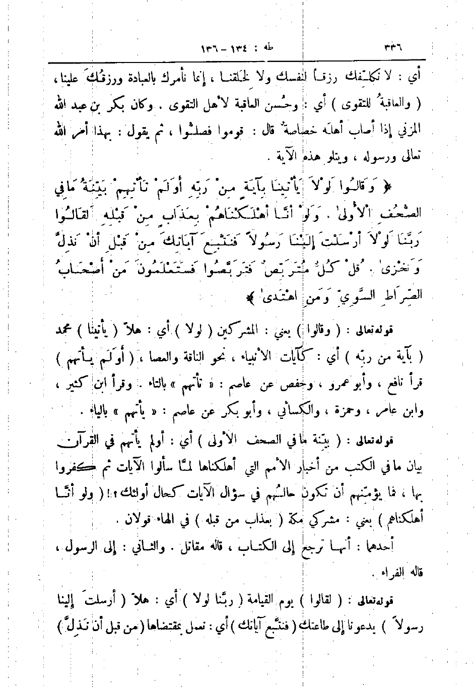 قوله تعالى بينه ما في الصحف الأولى أي أولم يأتهم في القرآن بيان وما في الكتب من أخبار الأمم التي أهلكناها لما سألوا الآيات ثم كفروا بها فما يؤمنهم أن تكون حالهم في سؤال الآيات كحال أولئك ولو انا أهلكناهم يعني مشركي مكة بعذاب من قبله في الهاء قولان