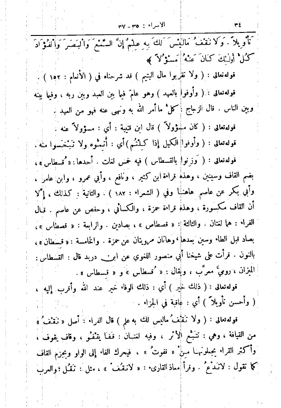 قوله تعالى وزنوا بالقسطاس فيه خمس لغات أحدها قسطاس بضم القاف وسينين وهذه قراءة ابن كثير ونافع وأبي عمرو وأبن عامر وأبي بكر عن عاصم هاهنا وفي الشعراء 182 والثانية كذلك إلا أن القاف مكسورة وهذه قراءة حمزة والكسائي وحفص عن عاصم قال الفراء هما لغتان والثالثة قصطاص بصادين والرابعة قصطاس بصاد قبل الطاء وسين بعدها وهاتان مرويتان عن حمزة والخامسة قسطان بالنون قرأت على شيخنا أبي منصور اللغوي عن ابن دريد قال القسطاس الميزان رومي معرب ويقال قسطاس و قسطاس