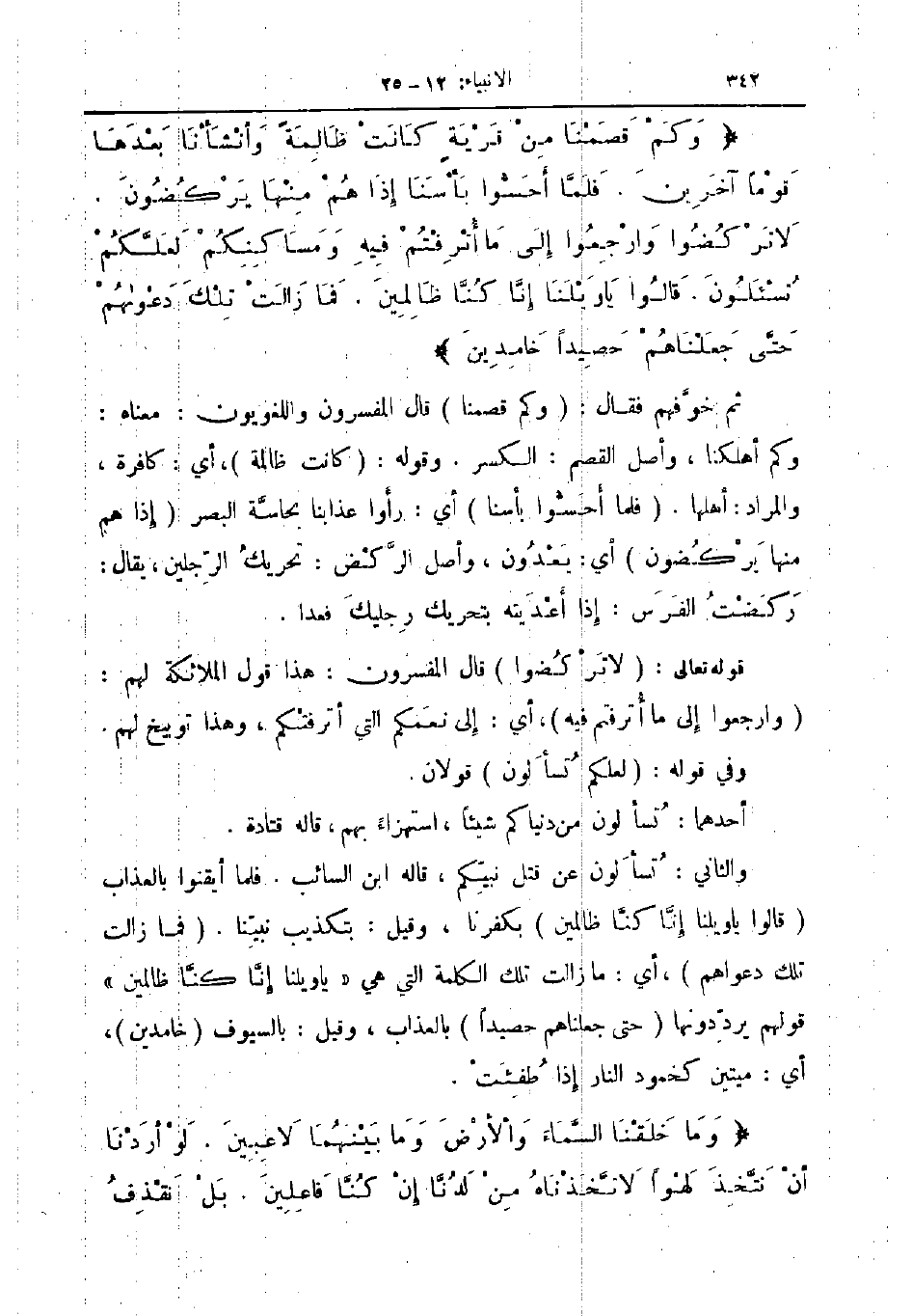 وكم قصمنا من قرية كانت ظالمة وأنشأنا بعدها قوما آخرين فلما أحسوا بأسنا إذا هم منها يركضون لا تركضوا وارجعوا الى ما اترفتم فيه ومساكنكم لعلكم تسئلون قالوا يا ويلنا إنا كنا ظالمين فما زالت تلك دعولهم حتى جعلناهم حصيدا خامدين