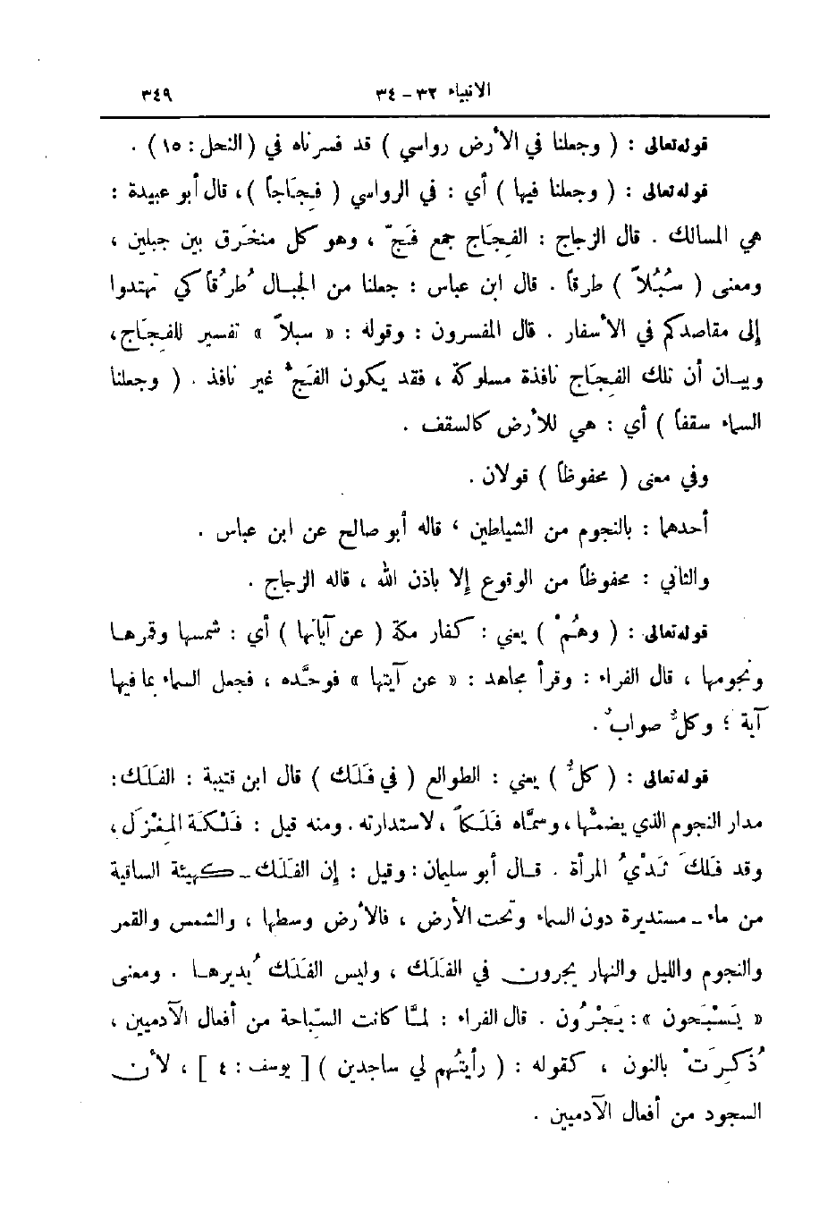 قوله تعالى وجعلنا فيها أي في الرواسي فجاجا قال ابو عبيدة هي المسالك قال الزجاج الفجاج جمع فج وهو كل منخرق بين جبلين ومعنى سبلا طرقا قال ابن عباس جعلنا من الجبال طرقا كي تهتدوا الى مقاصدكم في الأسفار قال المفسرون وقوله سبلا تفسير للفجاج وبيان أن تلك الفجاج نافذة مسلوكة فقد يكون الفج غير نافذ وجعلنا السماء سقفا أي هي الأرض كالسقف