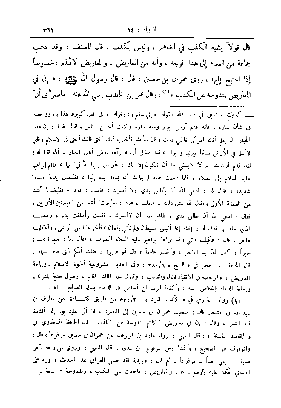قال قولا يشبه الكذب في الظاهر وليس بكذب قال المصنف وقد ذهب جماعة من العلماء إلى هذا الوجه وأنه من المعاريض والمعاريض لا تذم خصوصا إذا احتيج اليها روى عمران بن حصين قال قال رسول الله صلى الله عليه و سلم إن في المعاريض لمندوحة عن الكذب وقال عمر بن الخطاب رضي الله عنه ما يسرني أن