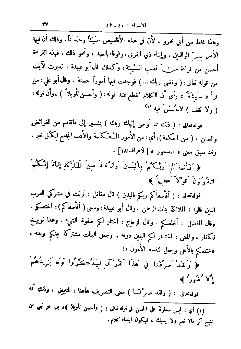 أفأصفاكم ربكم بالبنين واتخذ من الملائكة إناثا إنكم لتقولون قولا عظيما