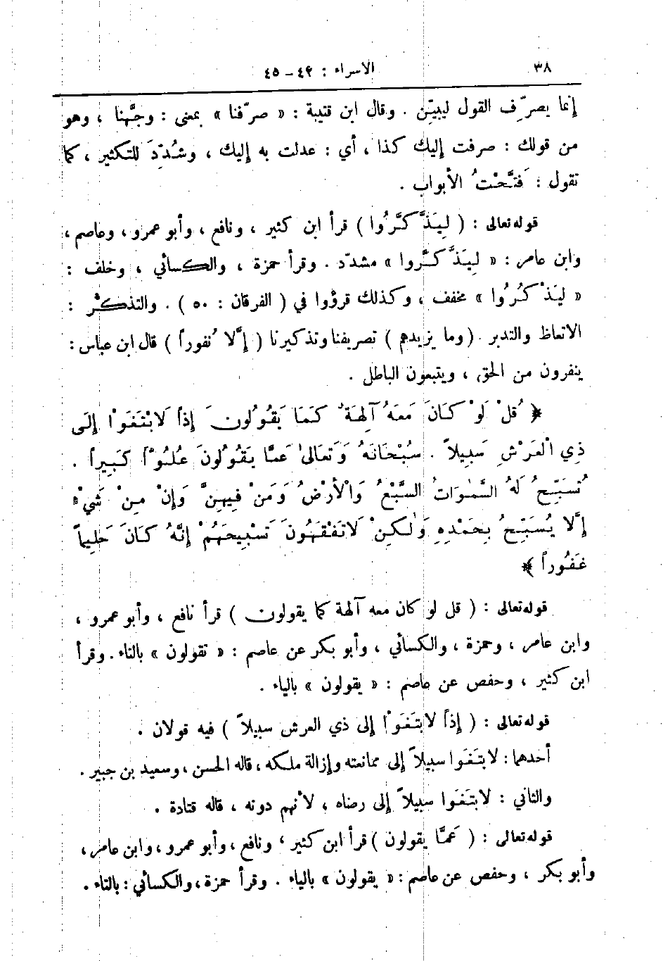 قوله تعالى قل لو كان معه آلهة كما يقولون قرأ نافع وأبو عمرو وأبن عامر وحمزة والكسائي وابو بكر عن عاصم تقولون بالتاء وقرأ ابن كثير وحفص عن عاصم يقولون بالياء
