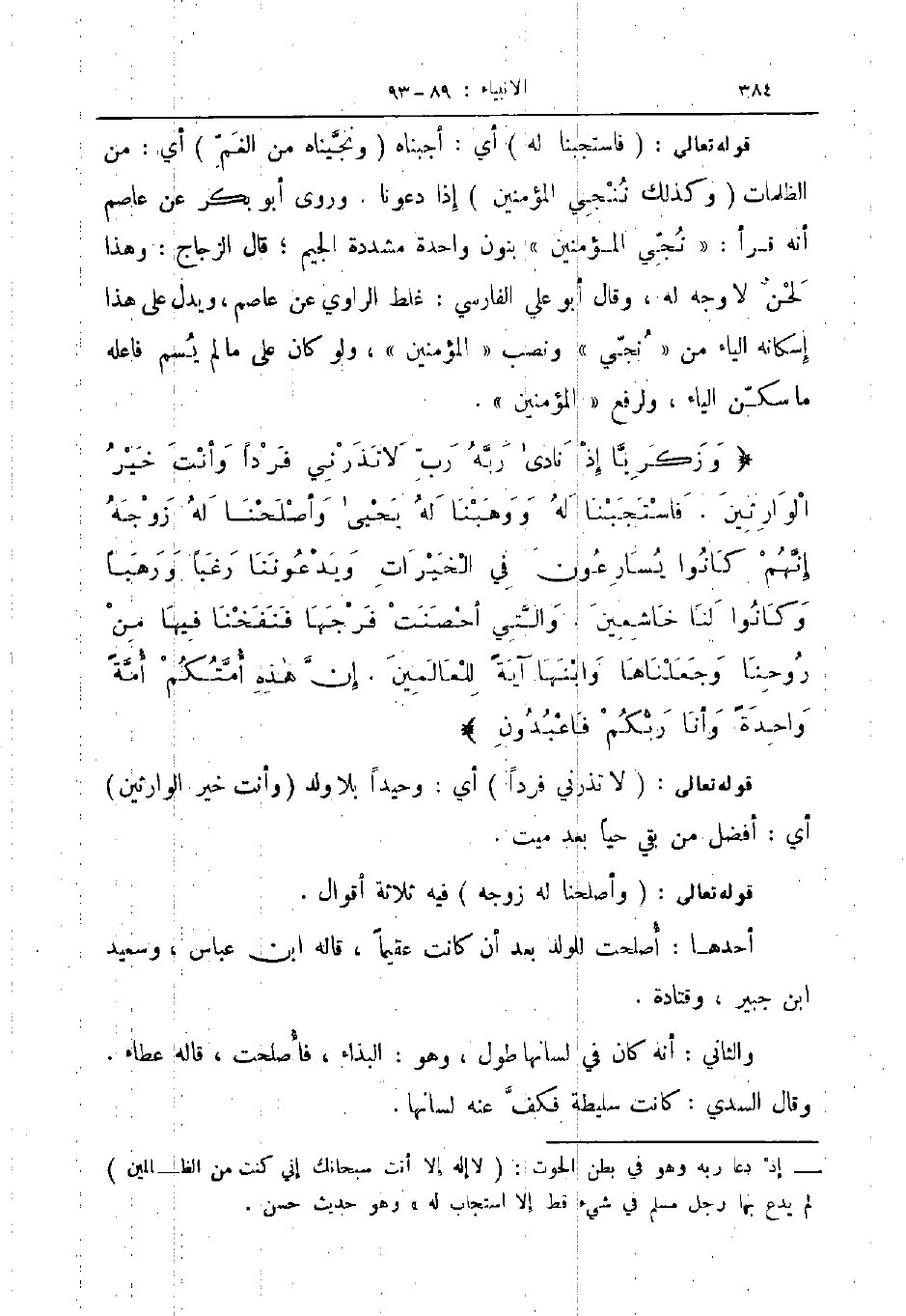 وزكريا إذ نادى ربه رب لا تذرني فردا وأنت خير الوارثين فاستجبنا له ووهبنا له يحيى وأصلحنا له زوجه إنهم كانوا يسارعون في الخيرات ويدعوننا رغبا ورهبا وكانوا لنا خاشعين والتي أحصنت فرجها فنفخنا فيها من روحنا وجعلناها وابنها آية للعالمين إن هذه أمتكم أمة واحدة وأنا ربكم فاعبدون