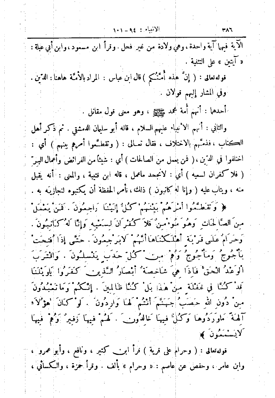 وتقطعوا أمرهم بينهم كل إلينا راجعون فمن يعمل من الصالحات وهو مؤمن فلا كفران لسعيه وإنا له كاتبون وحرام على قرية أهلكناها أنهم لا يرجعون حتى إذا فتحت يأجوج ومأجوج وهم من كل حدب ينسلون واقترب الوعد الحق فاذا هي شاخصة أبصار الذين كفروا ياويلنا قد كنا في غفلة من هذا بل كنا ظالمين إنكم وما تعبدون من دون الله حصب جهنم أنتم لها واردون لو كان هؤلاء آلهة ما وردوها وكل فيها خالدون لهم فيها زفير وهم فيها لا يسمعون