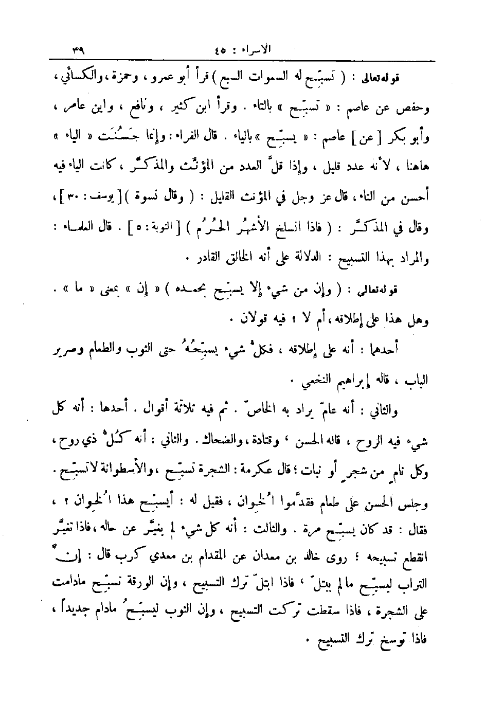قوله تعالى تسبح له السموات السبع قرأ أبو عمرو وحمزة والكسائي وحفص عن عاصم تسبح بالتاء وقرأ ابن كثير ونافع وابن عامر وأبو بكر عن عاصم يسبح بالياء قال الفراء وإنما حسنت الياء هاهنا لأنه عدد قليل وإذا قل العدد من المؤنث والمذكر كانت الياء فيه أحسن من التاء قال عز و جل في المؤنث القليل وقال نسوة يوسف 30 وقال في المذكر فاذا انسلخ الاشهر الحرم التوبه 5 قال العلماء والمراد بهذا التسبيح الدلالة على أنه الخالق القادر