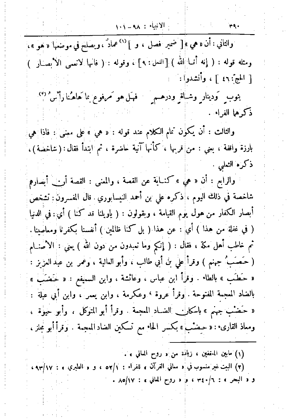 والرابع أن هي كناية عن القصة والمعنى القصة أن ابصارهم شاخصة في ذلك اليوم ذكره علي بن احمد النيسابوري قال المفسرون تشخص ابصار الكفار من هول يوم القيامة ويقولون يا ويلنا قد كنا أي في الدنيا في غفلة من هذا أي عن هذا بل كنا ظالمين أنفسنا بكفرنا ومعاصينا هم خاطب أهل مكة فقال إنكم وما تعبدون من دون الله يعني الاصنام حصب جهنم وقرأ علي بن ابي طالب وابو العالية وعمر بن عبد العزيز حطب بالطاء وقرأ ابن عباس وعائشة وابن السميفع حضب بالضاد المعجمة المفتوحة وقرأ عروة وعكرمة وابن يعمر وابن أبي عبلة حضب جهنم باسكان الضاد المعجمة وقرأ ابو المتوكل وأبو حيوة ومعاذ القارئ حضب بكسر الحاء مع تسكين الضاد المعجمة وقرأ ابو مجلز