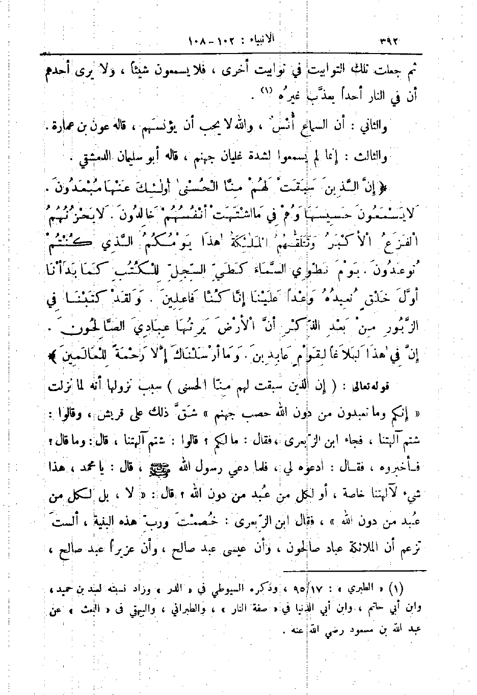 قوله تعالى إن الذين سبقت لهم منا الحسنى سبب نزولها أنه لما نزلت إنكم وما تعبدون من دون الله حصب جهنم شق ذلك على قريش وقالوا شتم آلهتنا فجاء ابن الزبعري فقال ما لكم قالوا شتم آلهتنا قال وما قال فاخبروه فقال ادعوه لي فلما دعي رسول الله صلى الله عليه و سلم قال يا محمد هذا شيء لآلهتنا خاصة أو لكل من عبد من دون الله قال لا بل لكل من عبد من دون الله فقال ابن الزبعري خصمت ورب هذه البنية ألست تزعم أن الملائكة عباد صالحون وأن عيسى عبد صالح وأن عزيرا عبد صالح