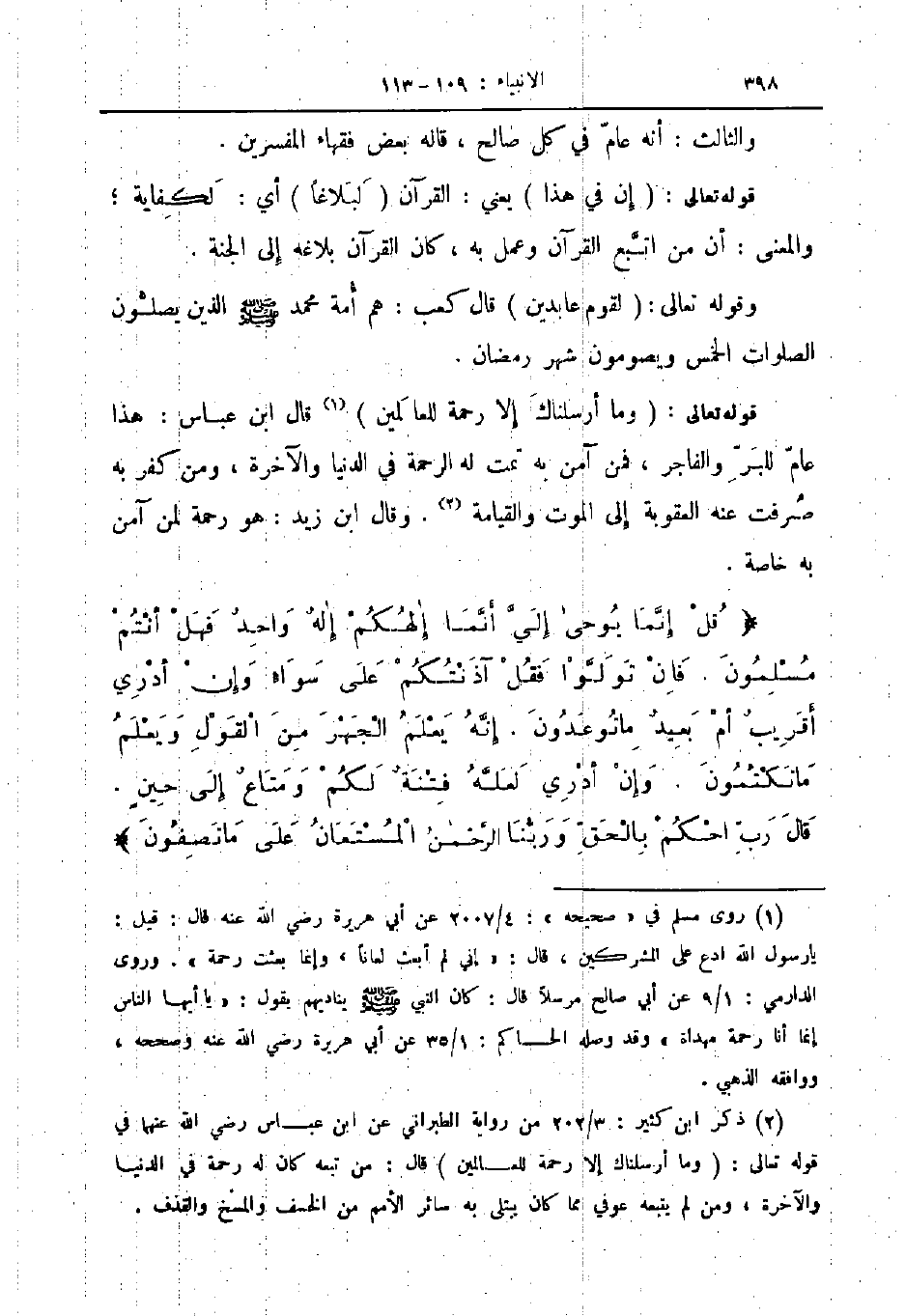 قوله تعالى وما أرسلناك إلا رحمة للعالمين قال ابن عباس هذا عام للبر والفاجر فمن آمن به تمت له الرحمة في الدنيا والآخرة ومن كفر به صرفت عنه العقوبة الى الموت والقيامة وقال ابن زيد هو رحمة لمن آمن به خاصة