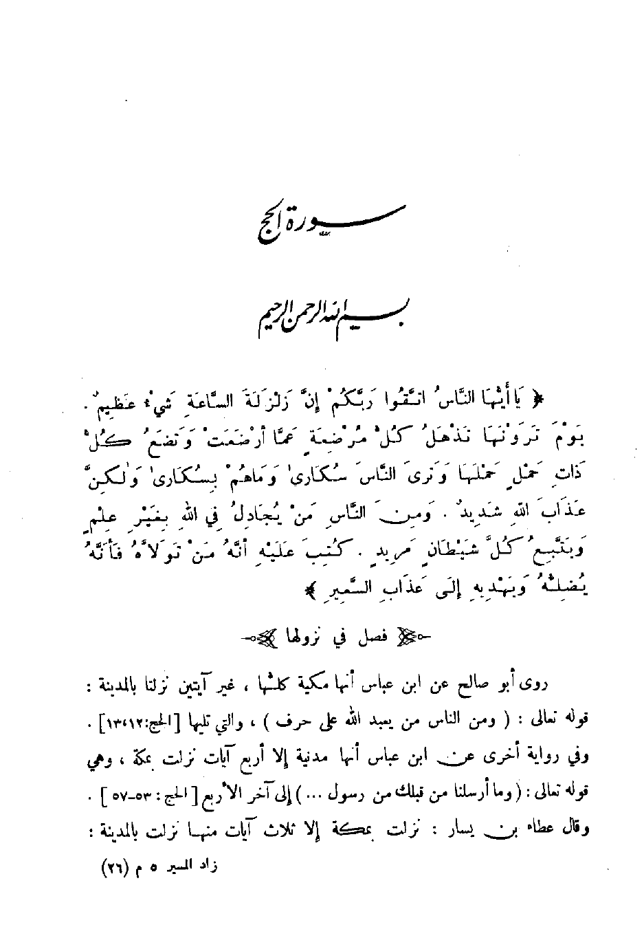 يا أيها الناس اتقوا ربكم إن زلزلة الساعة شيء عظيم يوم ترونها تذهل كل مرضعة عما أرضعت وتضع كل ذات حمل حملها وترى الناس سكارى وماهم بسكارى ولكن عذاب الله شديد ومن الناس من يجادل في الله بغير علم ويتبع كل شيطان مريد كتب عليه أنه من تولاه فأنه يضله ويهديه الى عذاب السعير
