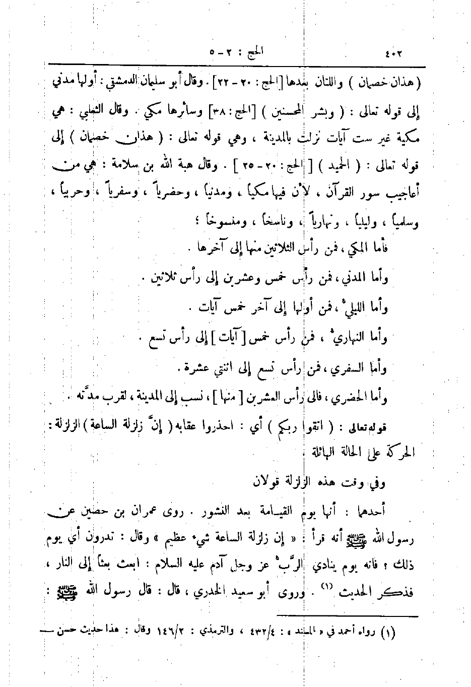 هذان خصمان واللتان بعدها الحج 22 , 20 وقال ابو سليمان الدمشقي أولها مدني الى قوله تعالى وبشر المحسنين الحج 38 وسائرها مكي وقال الثعلبي هي مكية غير ست آيات نزلت بالمدينة وهي قوله تعالى هذان خصمان الى قوله تعالى الحميد الحج 25 , 20 وقال هبة الله بن سلامة هي من أعاجيب سور القرآن لأن فيها مكية ومدنيا وحضريا وسفريا وحربيا وسلميا وليليا ونهاريا وناسخا ومنسوخا