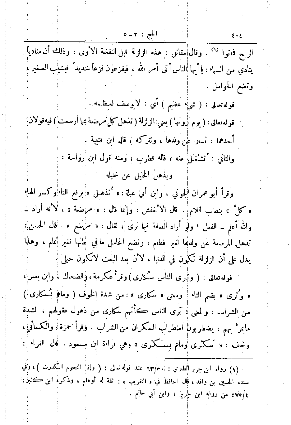 وقرأ ابو عمران الجوني وابن ابي عبلة تذهل برفع التاء وكسر الهاء كل بنصب اللام قال الأخفش وإنما قال مرضعة لأنه أراد والله أعلم الفعل ولو اراد الصفة فيما نرى لقال مرضع قال الحسن تذهل المرضعة عن ولدها لغير فطام وتضع الحامل ما في بطنها لغير تمام وهذا يدل على أن الزلزلة تكون في الدنيا لأن بعد البعث لا تكون حبلى