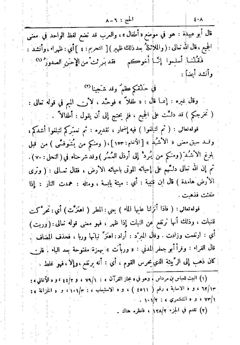 قوله تعالى ثم لتبلغوا فيه اضمار تقديره ثم نعمركم لتبلغوا اشدكم وقد سبق معنى الأشد الأنعام 153 ومنكم من يتوفى من قبل بلوغ الأشد ومنكم من يرد الى ارذل العمر وقد شرحناه في النحل 70 ثم إن الله تعالى دلهم على احيائه الموتى باحيائه الأرض فقال تعالى وترى الأرض هامدة قال ابن قتيبة أي ميتة يابسة ومثله همدت النار إذا طفئت فذهبت