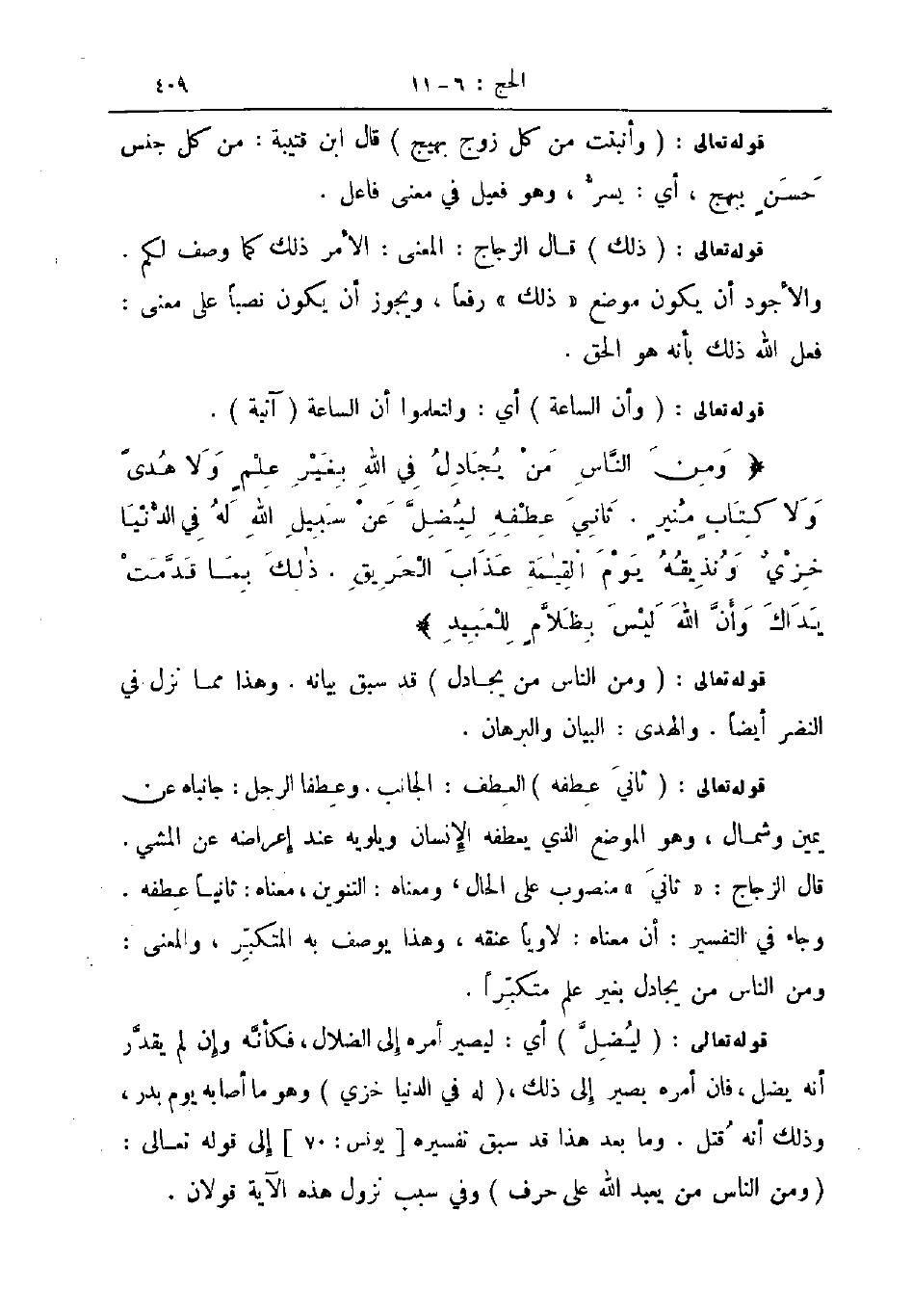 قوله تعالى ثاني عطفه العطف الجانب وعطفا الرجل جانباه عن يمين وشمال وهو الموضع الذي يعطفه الإنسان ويلويه عند إعراضه عن المشي قال الزجاج ثاني منصوب على الحال ومعناه التنوين معناه ثانيا عطفه وجاء في التفسير أن معناه لاويا عنقه وهذا يوصف به المتكبر والمعنى ومن الناس من يجادل بغير علم متكبرا