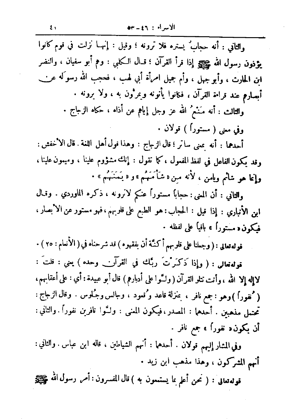 قوله تعالى وإذا ذكرت ربك في القرآن وحده يعني قلت لا إله إلا الله وأنت تتلو لقرآن ولوا على أدبارهم قال ابو عبيدة أي على أعقابهم نفورا وهو جمع نافر بمنزلة قاعد وقعود وجالس وجلوس وقال الزجاج تحتمل مذهبين أحدهما المصدر فيكون المعنى ولوا نافرين نفورا والثاني ان يكون نفورا جمع نافر