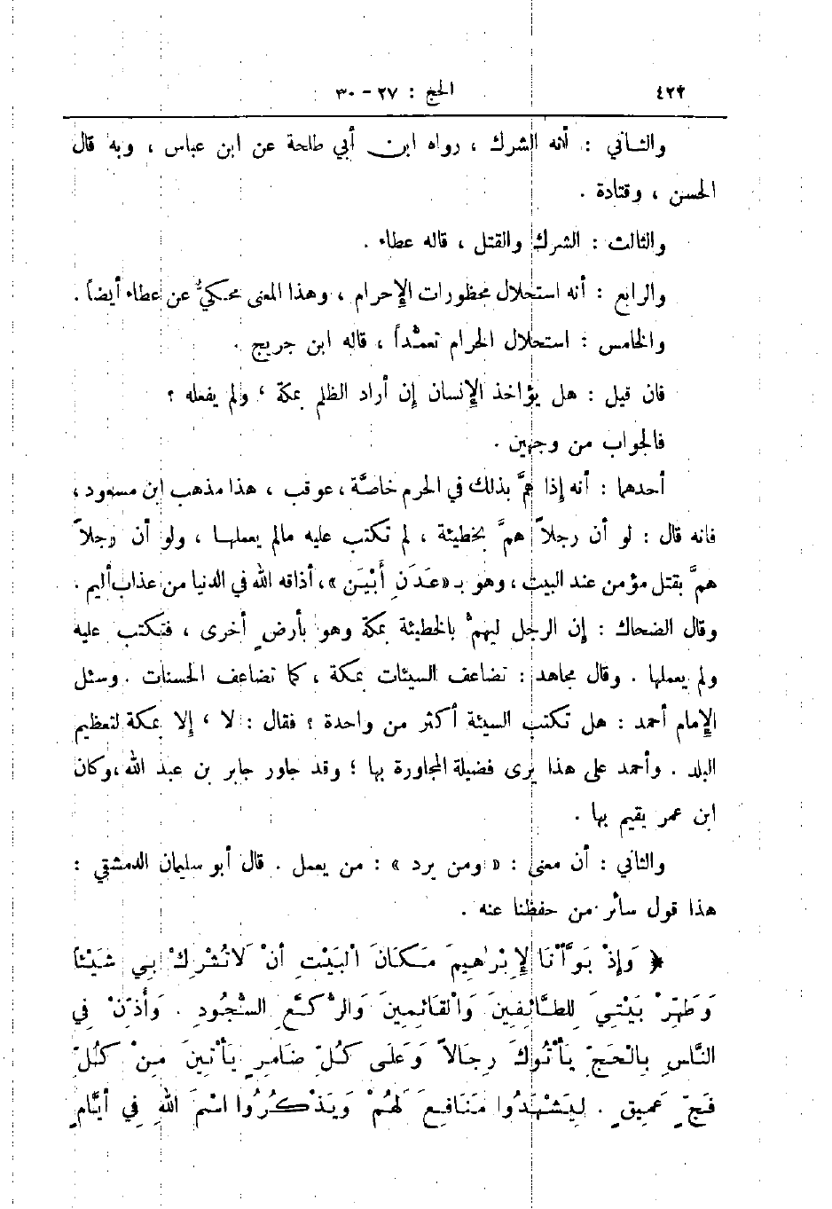 وإذا بوأنا لإبرهيم مكان البيت أن لا تشرك بي شيئا وطهر بيتي للطائفين والقائمين والركع السجود وأذن في الناس بالحج يأتوك رجالا وعلى كل ضامر يأتين من كل فج عميق ليشهدوا منافع لهم ويذكروا اسم الله في أيام