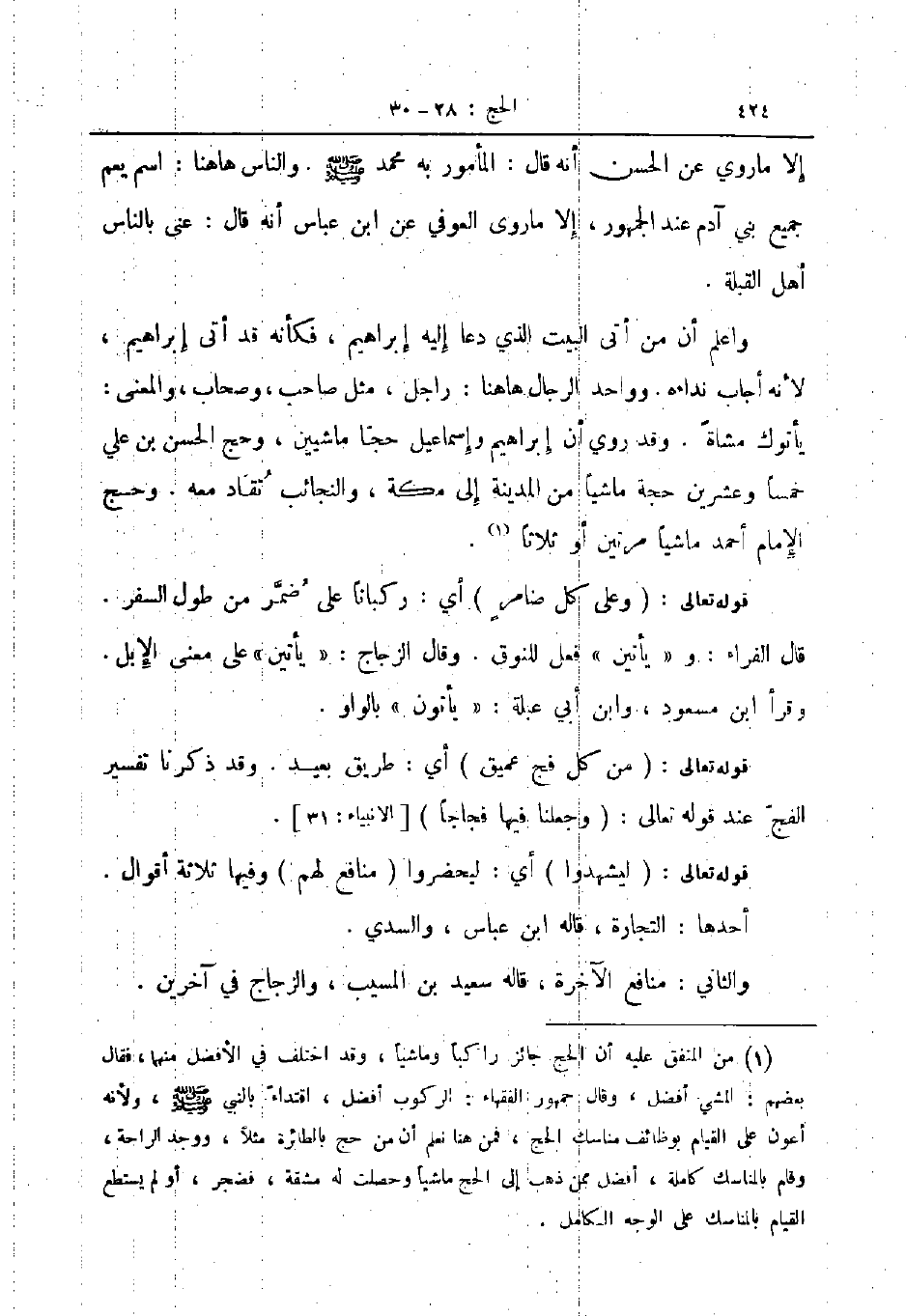 واعلم أن من أتى البيت الذي دعا اليه ابراهيم فكأنه قد أتى ابراهيم لأنه أجاب نداءه وواحد الرجال هاهنا راجل مثل صاحب وصحاب والمعنى يأتوك مشاة وقد روي ان ابراهيم واسماعيل حجا ماشيين وحج الحسن بن علي خمسا وعشرين حجة ماشيا من المدينة الى مكة والنجائب تقاد معه وحج الإمام أحمد ماشيا مرتين أو ثلاثا