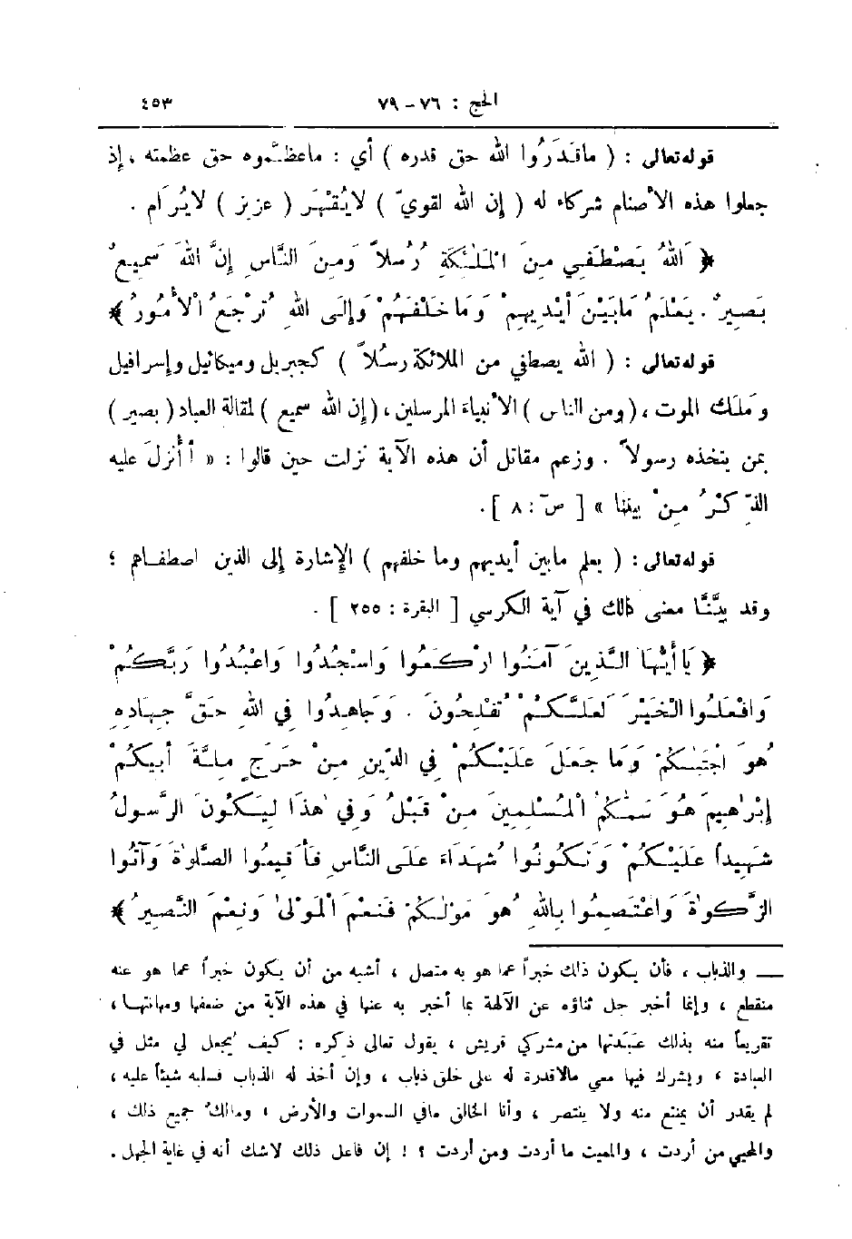 يا أيها الذين آمنوا اركعوا واسجدوا واعبدوا ربكم وافعلوا الخير لعلكم تفلحون وجاهدوا في الله حق جهاده هو اجتباكم وما جعل عليكم في الدين من حرج ملة أبيكم ابراهيم هو سمكم المسلمين من قبل وفي هذا ليكون الرسول شهيدا عليكم وتكونوا شهداء على الناس فأقيموا الصلوة وآتوا الزكوة واعتصموا بالله هو مولكم فنعم المولى ونعم النصير