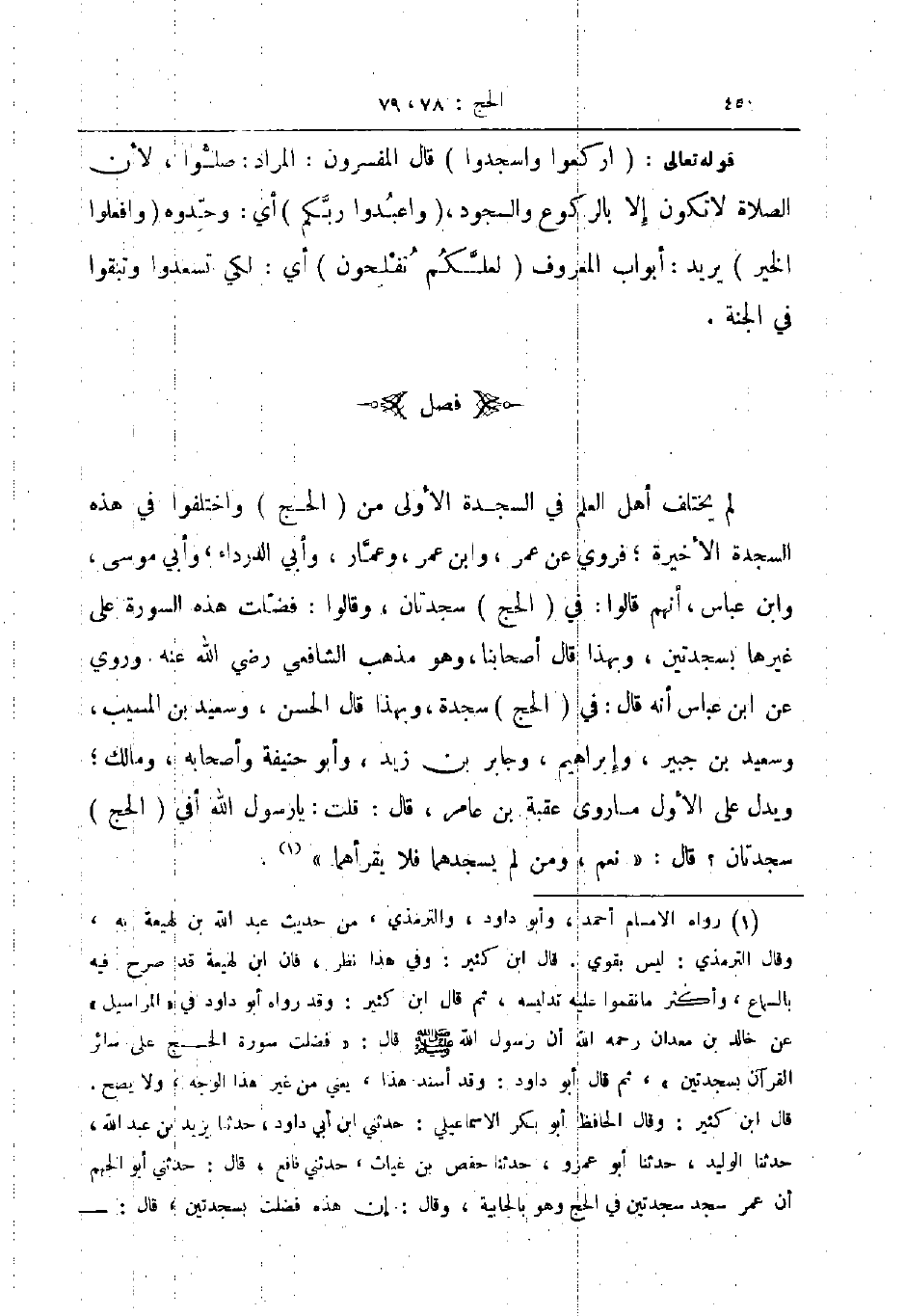لم يختلف أهل العلم في السجدة الأولى من الحج واختلفوا في هذه السجدة الأخيرة فروي عن عمر وابن عمر وعمار وابي الدرداء وابي موسى وابن عباس أنهم قالوا في الحج سجدتان وقالوا فضلت هذه السورة على غيرها بسجدتين وبهذا قال أصحابنا وهو مذهب الشافعي رضي الله عنه وروي عن ابن عباس انه قال في الحج سجدة وبهذا قال الحسن وسعيد بن المسيب وسعيد بن جبير وابراهيم وجابر بن زيد وابو حنيفة وأصحابه ومالك ويدل على الأول ما روى عقبة بن عامر قال قلت يا رسول الله أفي الحج سجدتان قال نعم ومن لم يسجدهما فلا يقرأهما