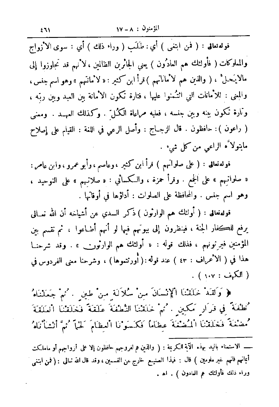 قوله تعالى فمن ابتغى أي طلب وراء ذلك أي سوى الأزواج والمملوكات فأولئك هم العادون يعني الجائرين الظالمين لأنهم قد تجاوزوا الى مالا يحل والذين هم لأماناتهم قرأ أبن كثير لأمانتهم وهو اسم جنس والمعنى للأمانات التي ائتمنوا عليها فتارة تكون الأمانة بين العبد وبين ربه وتارة تكون بينه وبين جنسه فعليه مراعاة الكل وكذلك العهد ومعنى راعون حافظون قال الزجاج وأصل الرعي في اللغة القيام على اصلاح ما يتولاه الراعي من كل شيء