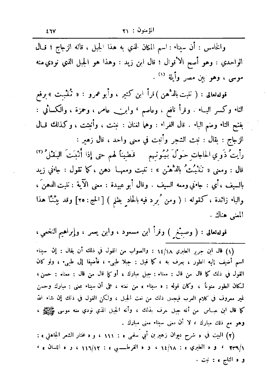 قوله تعالى تنبت بالدهن قرأ ابن كثير وأبو عمرو تنبت برفع التاء وكسر الباء وقرأ نافع وعاصم وابن عامر وحمزة والكسائي بفتح التاء وضم الباء قال الفراء وهما لغتان نبتت وأنبتت وكذلك قال الزجاج يقال نبت الشجر وأنبت في معنى واحد قال زهير ... رأيت ذوي الحاجات حول بيوتهم ... قطينا لهم حتى إذا أنبت البقل ...