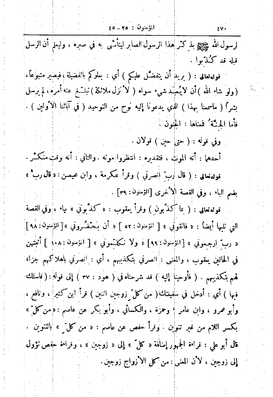 قوله تعالى بما كذبون وقرأ يعقوب كذبوني بياء وفي القصة التي تليها أيضا فاتقوني المؤمنون 52 أن يحضروني المؤمنون 98 رب أرجعوني المؤمنون ولا تكلموني المؤمنون 108 أثبتهن في الحالين يعقوب والمعنى انصرني بتكذيبهم أي انصرني باهلاكهم جزاء لهم بتكذيبهم فأوحيانا اليه قد شرحناه في هود 37 الى قوله فاسلك فيها أي أدخل في سفينتك من كل زوجين اثنين قرأ ابن كثير ونافع وأبو عمرو وابن عامر وحمزة والكسائي وابو بكر عن عاصم من كل بكسر اللام من غير تنوين وقرأ حفص عن عاصم من كل بالتنوين قال ابو علي قراءة الجمهور إضافة كل الى زوجين وقراءة حفص تؤول الى زوجين لأن المعنى من كل الأزواج زوجين
