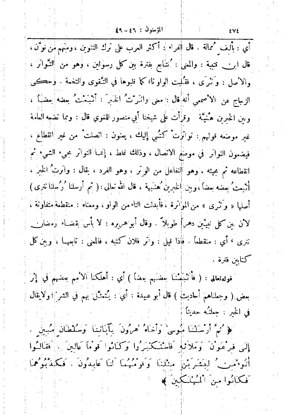 أي بألف ممالة قال الفراء أكثر العرب على ترك التنوين ومنهم من نون قال ابن قتيبة والمعنى نتابع بفترة بين كل رسولين وهو من التواتر والأصل وترى فقبلت الواو تاء كما قلبوها في التقوى والتخمة وحكى الزجاج عن الأصمعي أنه قال معنى واترت الخبر اتبعت بعضه بعضا وبين الخبرين هنية وقرات على شيخنا أبي منصور اللغوي قال ومما تضعه العامة غير موضعه قولهم تواترت كتبي اليك يعنون اتصلت من غير انقطاع فيضعون التواتر في موصع الاتصال وذلك غلط إنما التواتر مجيء الشيء ثم انقطاعة ثم مجيئه وهو التفاعل من الوتر وهو الفرد يقال واترت الخبر أتبعت بعضه بعضا وبين الخبرين هنيهة قال الله تعالى ثم أرسلنا رسلنا تترى أصلها وترى من المواترة فأبدلت التاء من الواو ومعناه منقطعة متفاوته لأن بين كل نبيين دهرا طويلا وقال أبو هريرة لا بأس بقضاء رمضان تترى أي منقطعا فاذا قيل واتر فلان كتبه فالمعنى تابعها وبين كل كتابين فقرة