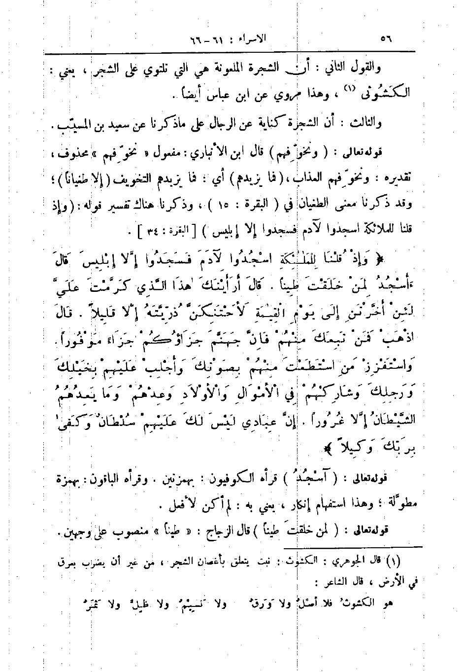 قوله تعالى ونخوفهم قال ابن الأنباري مفعول نخوفهم محذوف تقديره ونخوفهم العذاب فما يزيدهم أي فما يزيدهم التخويف إلا طغيانا وقد ذكرنا معنى الطغيان في البقرة 15 وذكرنا هناك تفسير قوله وإذ قلنا للملائكة اسجدوا لآدم فسجدوا إلا إبليس البقرة 34