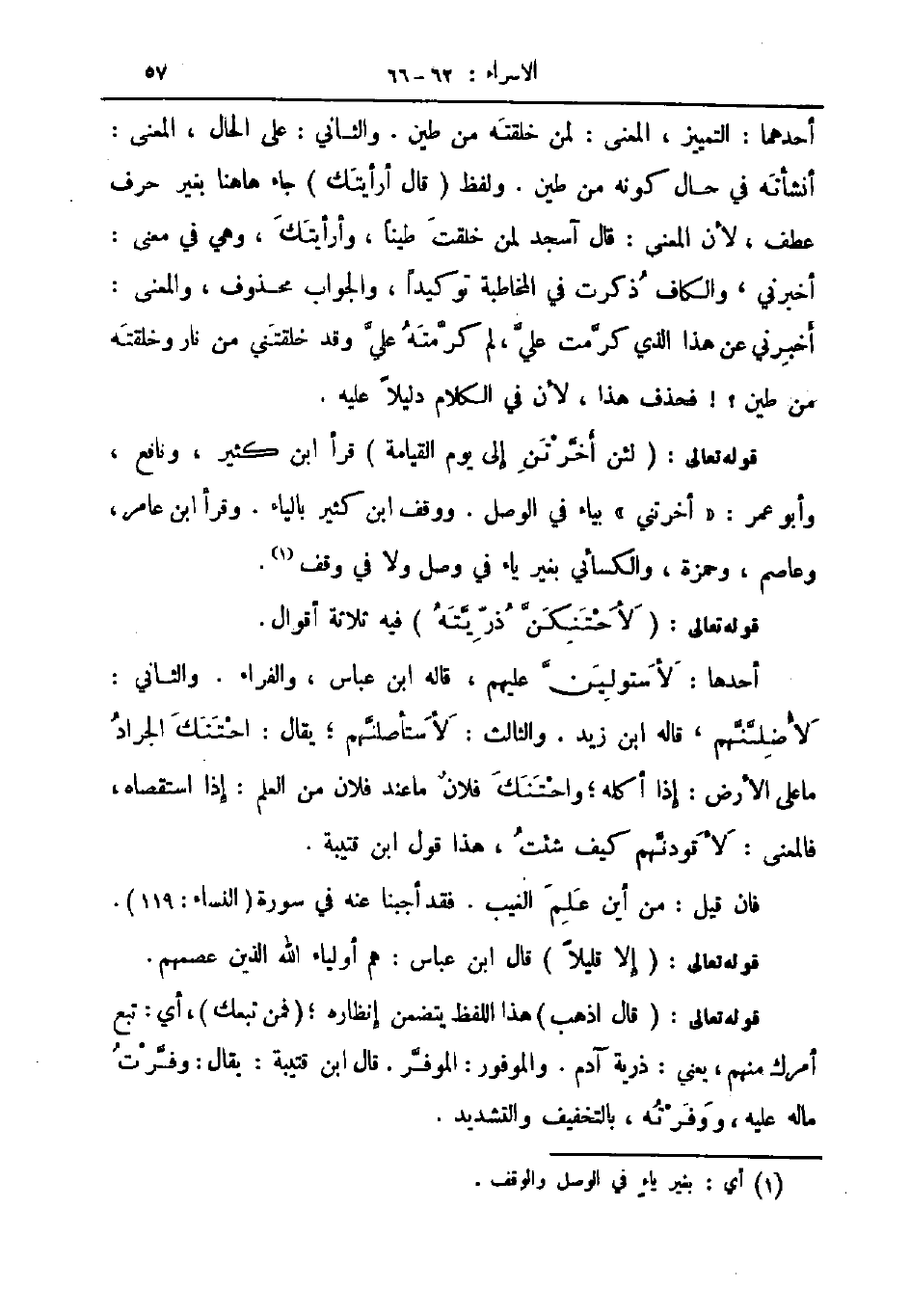 قوله تعالى لئن أخرتن الى يوم القيامة قرأ ابن كثير ونافع وأبو عمر أخرتني بياء في الوصل وقف أبن كثير بالياء وقرأ ابن عامر وعاصم وحمزة والكسائي بغير ياء في وصل ولا في وقف