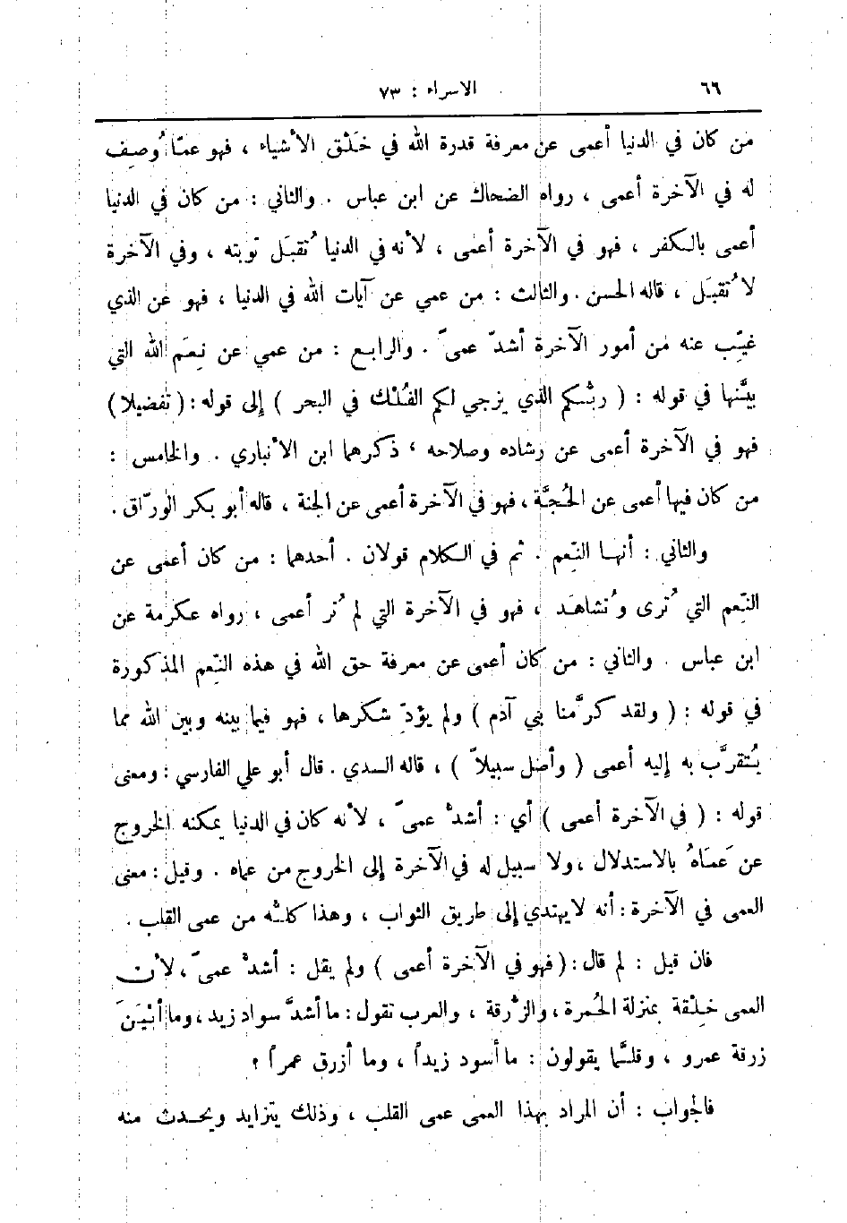 من كان في الدنيا أعمى عن معرفة قدرة الله في خلق الأشياء فهو عما وصف له في الآخرة أعمى رواه الضحاك عن ابن عباس والثاني من كان في الدنيا أعمى بالكفر فهو في الآخرة أعمى لأنه في الدنيا تقبل توبته وفي الآخرة لا تقبل قاله الحسن والثالث من عمي عن آيات الله في الدنيا فهو عن الذي غيب عنه من أمور الآخرة أشد عمى والرابع من عمي عن نعم الله التي بينها في قوله ربكم الذي يزجي لكم الفلك في البحر إلى قوله تفضيلا فهو في الآخرة أعمى عن رشاده وصلاحه ذكرهما ابن الأنباري والخامس من كان فيها أعمى عن الحجة فهو في الآخرة أعمى عن الجنة قاله ابو بكر الوراق