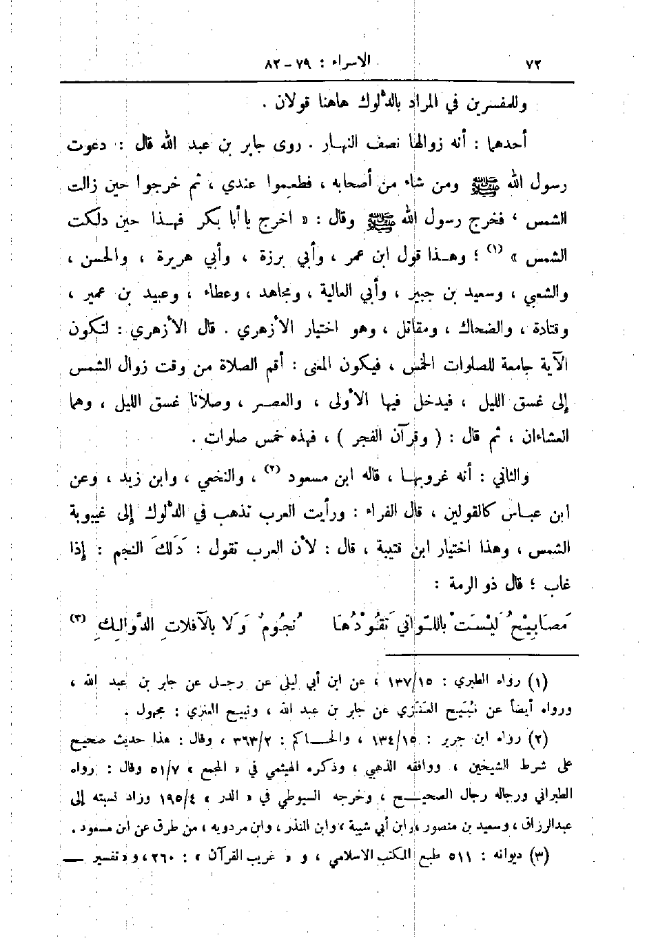 أحدهما أنه زوالها نصف النهار روى جابر بن عبد الله قال دعوت رسول الله صلى الله عليه و سلم ومن شاء من اصحابه فطعموا عندي ثم خرجوا حين زالت الشمس فخرج رسول الله صلى الله عليه و سلم وقال اخرج يا أبا بكر فهذا حيث دلكت الشمس وهذا قول ابن عمر وأبي برزة وأبي هريرة والحسن والشعبي وسعيد بن جبير وأبي العالية ومجاهد وعطاء وعبيد بن عمير وقتادة والضحاك ومقاتل وهو اختيار الأزهري قال الأزهري لتكون الآية جامعة للصلوات الخمس فيكون المعنى أقم الصلاة من وقت زوال الشمس الى غسق الليل فيدخل فيها الأولى والعصر وصلاتا غسق الليل وهما العشاءان ثم قال وقرآن الفجر فهذه خمس صلوات