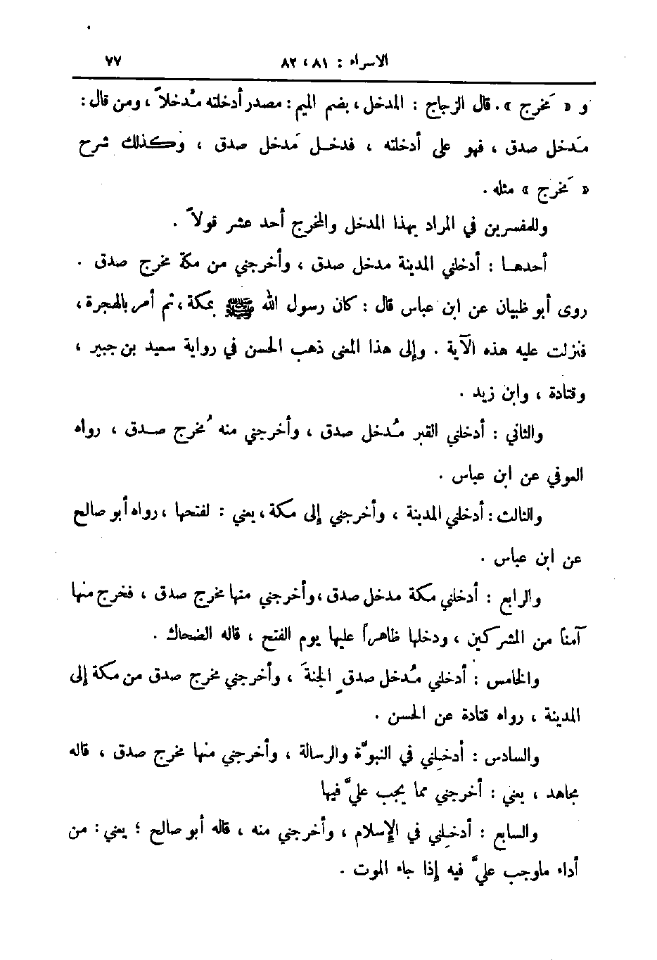 أحدها أدخلني المدينة مدخل صدق وأخرجني من مكة مخرج صدق روى أبو ظبيان عن ابن عباس قال كان رسول الله صلى الله عليه و سلم بمكة ثم أمر بالهجرة فنزلت عليه هذه الآية وإلى هذا المعنى ذهب الحسن في رواية سعيد بن جبير وقتادة وابن زيد
