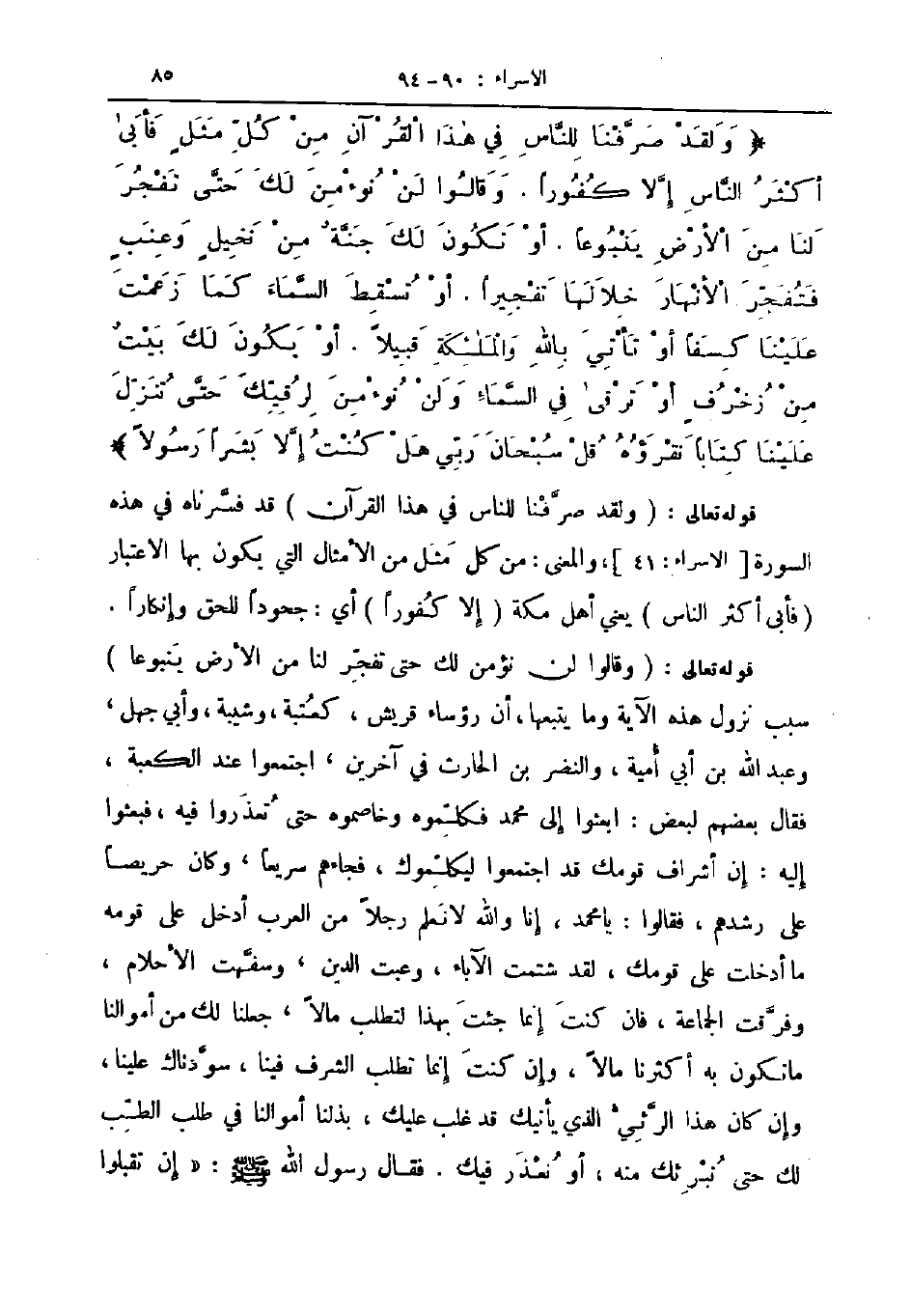 ولقد صرفنا للناس في هذا القرآن من كل مثل فأبى أكثر الناس إلا كفورا وقالوا لن نؤمن لك حتى تفجر لنا من الأرض ينبوعا أو تكون لك جنة من نخيل وعنب فتفجر الأنهار خلالها تفجيرا أو تسقط السماء كما زعمت علينا كسفا أو تأتي بالله والملائكة قبيلا أو يكون لك بيت من زخرف أو ترقى في السماء ولن نؤمن لرقيك حتى تنزل علينا كتابا نقرؤه قل سبحان ربي هل كنت إلا بشرا رسولا