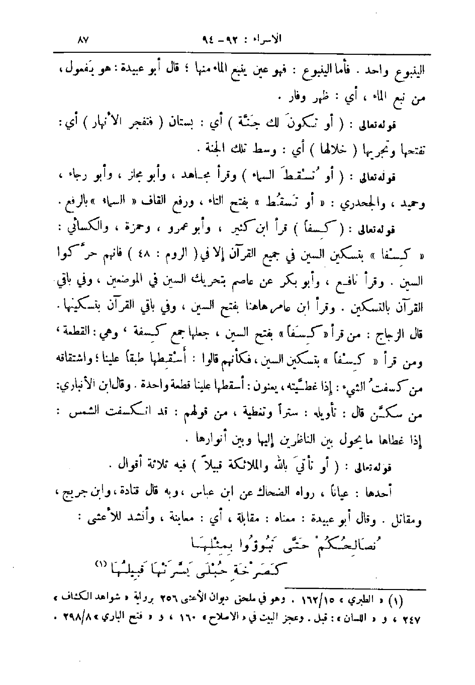قوله تعالى كسفا قرأ ابن كثير وأبو عمرو وحمزة والكسائي كسفا بتسكين السين في جميع القرآن إلا في الروم 48 فانهم حركوا السين وقرأ نافع وأبو بكر عن عاصم بتحريك السين في الموضعين وفي باقي القرآن بالتسكين وقرأ ابن عامر هاهنا بفتح السين وفي باقي القرآن بتسكينها قال الزجاج من قرأ كسفا بفتح السين جعلها جمع كسفة وهي القطعة ومن قرأ كسفا بتسكين السين فكأنهم قالوا أسقطها طبقا علينا واشتقاقه من كسفت الشيء إذا غطيته يعنون أسقطها علينا قطعة واحدة وقال ابن الأنباري من سكن قال تأويله سترا وتغطية من قولهم قد انكسفت الشمس إذا غطاها ما يحول بين الناظرين إليها وبين أنوارها