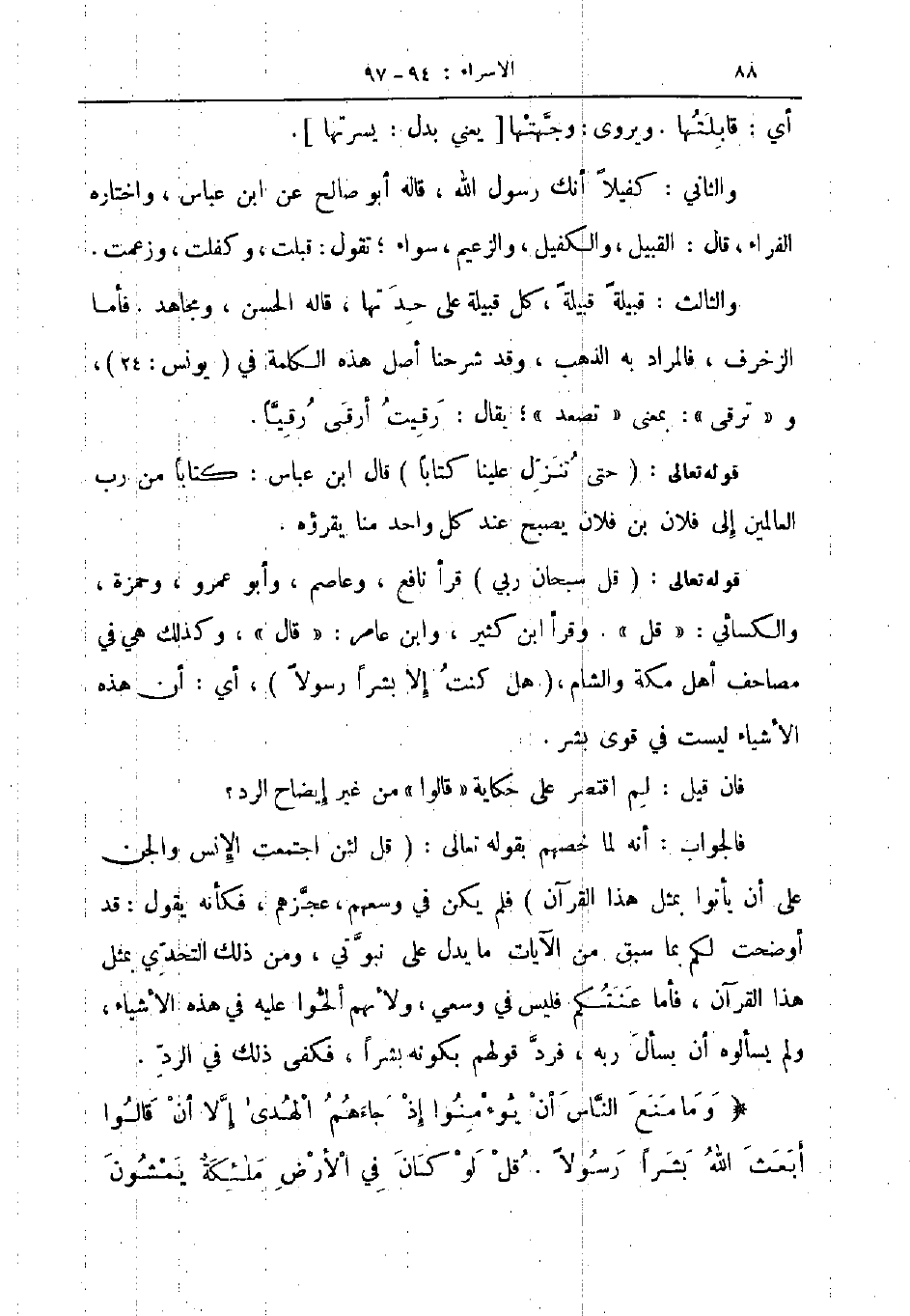 قوله تعالى قل سبحان ربي قرأ نافع وعاصم وأبو عمرو وحمزة والكسائي قل وقرأ ابن كثير وابن عامر قال وكذلك هي في مصاحف اهل مكة والشام هل كنت الا بشرا رسولا أي أن هذه الأشياء ليست في قوى البشر