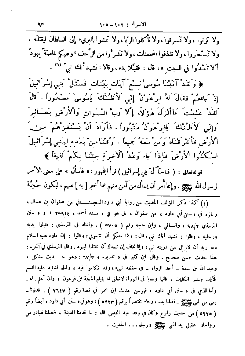 ولقد آتينا موسى تسع آيات بينات فسئل بني إسرائيل إذ جاءهم فقال له فرعون إني لأظنك يا موسى مسحورا قال لقد علمت ما أنزل هؤلاء إلا رب السموات والارض بصائر وإني لأظنك يا فرعون مثبورا فأراد أن يستفزهم من الأرض فأغرقناه ومن معه جميعا وقلنا من بعده لبني إسرائيل اسكنوا الأرض فإذا جاء وعد الاخرة جئنا بكم لفيفا