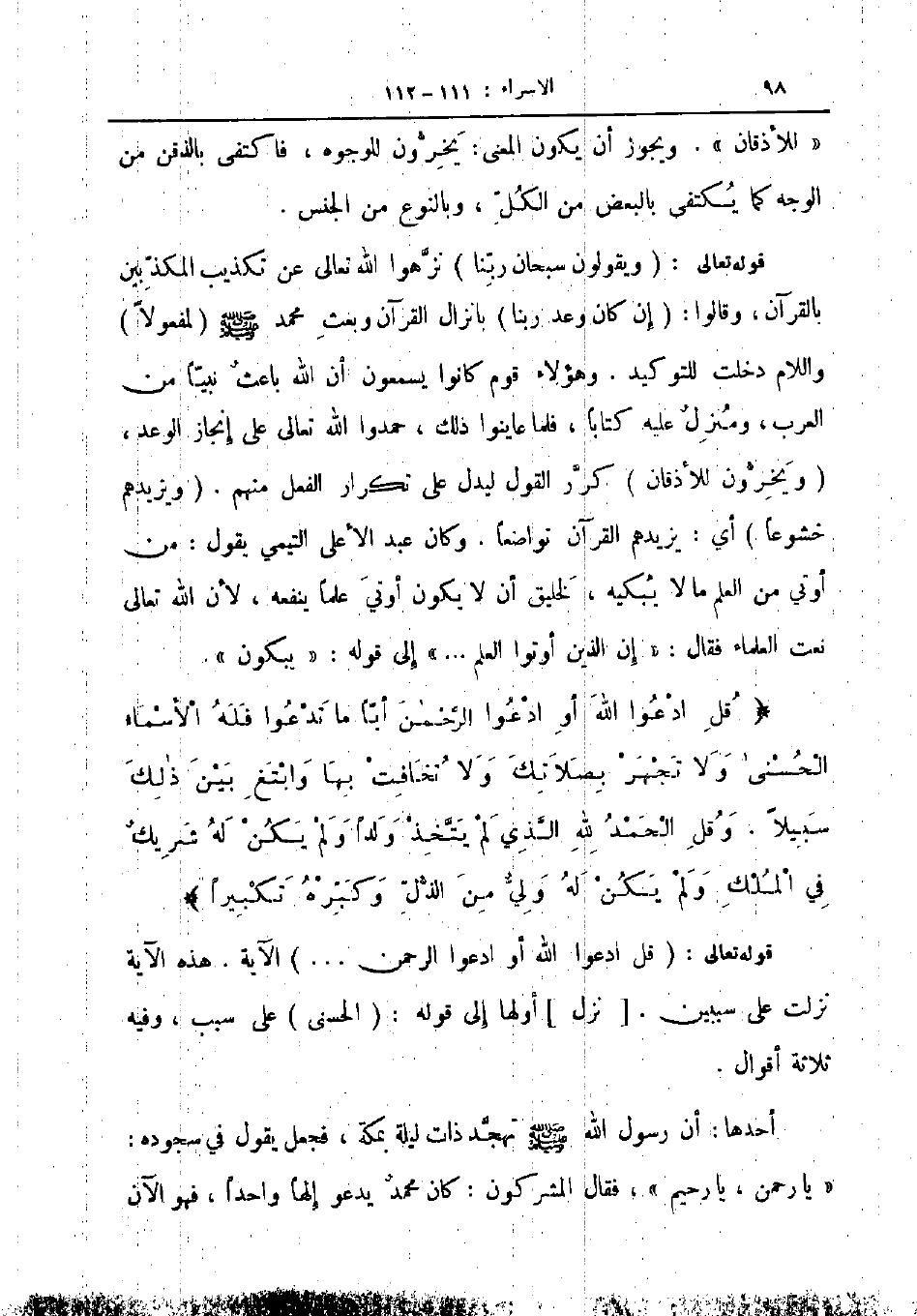 قل ادعوا الله أو ادعوا الرحمن أيا ما تدعوا فله الأسماء الحسنى ولا تجهر بصلاتك ولا تخافت بها وابتغ بين ذلك سبيلا وقل الحمد لله الذي لم يتخذ ولدا ولم يكن له شريك في الملك ولم يكن له ولي من الذل وكبره تكبيرا