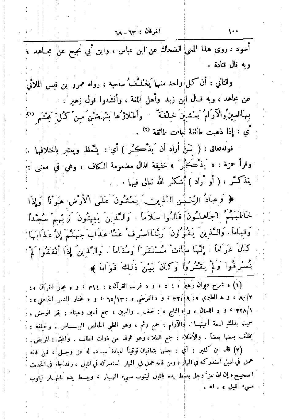قوله تعالى لمن أراد أن يذكر أي يتعظ ويعتبر باختلافهما وقرأ حمزة يذكر خفيفة الذال مضمومة الكاف وهي في معنى يتذكر أو أراد شكر الله تعالى فيهما وعباد الرحمن الذين يمشون على الأرض هونا وإذا خاطبهم الجاهلون قالوا سلاما والذين يبيتون لربهم سجدا وقياما والذين يقولون ربنا اصرف عنا عذاب جهنم إن عذابها كان غراما إنها ساءت مستقرا ومقاما والذين إذا أنفقوا لم يسرفوا ولم يقتروا وكان بين ذلك قواما
