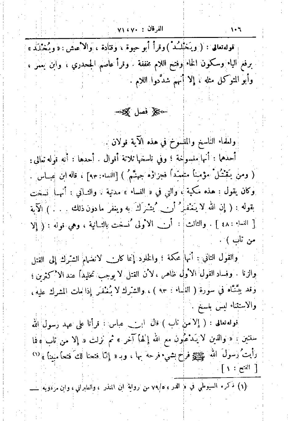 قوله تعالى إلا من تاب قال ابن عباس قرأنا على عهد رسول الله سنتين والذين لا يدعون مع الله إلها آخر ثم نزلت إلا من تاب فما رأيت رسول الله صلى الله عليه و سلم فرح بشئ فرحه بها وب إنا فتحنا لك فتحا مبينا الفتح